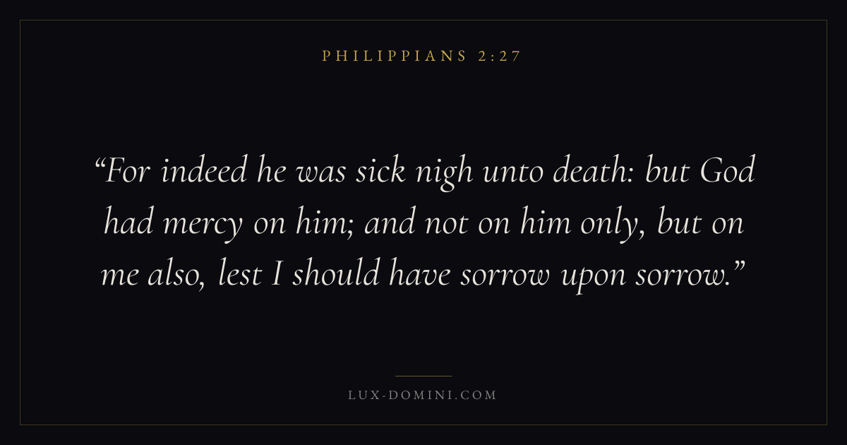 For indeed he was sick nigh unto death: but God had mercy on him; and not on him only, but on me also, lest I should have sorrow upon sorrow.