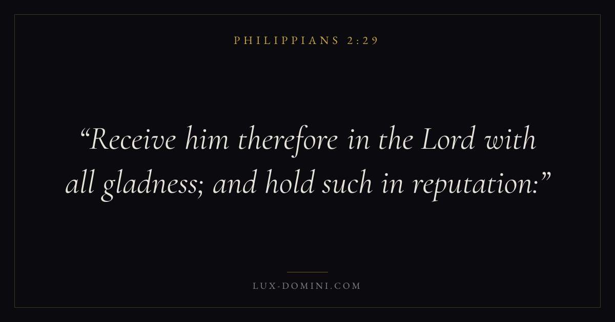 Books / Philippians / Chapter 2 / Verse 29 ← Philippians 2:28 Philippians 2:29 Philippians 2:30 → Receive him therefore in the Lord with all gladness; and hold such in reputation: Download verse card Share on Twitter Share on Facebook Pin it ✦ Key themes HopeSuffering and trialsHumilityJoy Read with Philippians 2:28Philippians 2:30Romans 8:24Revelation 21:4 Related topics Bible verses about hopeBible verses about suffering and trialsBible verses about humility ✦ Philippians Chapter 2 verses V. 1 V. 2 V. 3 V. 4 V. 5 V. 6 V. 7 V. 8 V. 9 V. 10 V. 11 V. 12 V. 13 V. 14 V. 15 V. 16 V. 17 V. 18 V. 19 V. 20 V. 21 V. 22 V. 23 V. 24 V. 25 V. 26 V. 27 V. 28 V. 29 V. 30