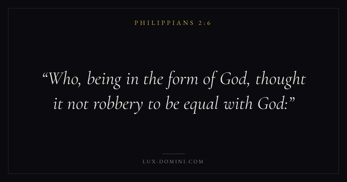 Books / Philippians / Chapter 2 / Verse 6 ← Philippians 2:5 Philippians 2:6 Philippians 2:7 → Who, being in the form of God, thought it not robbery to be equal with God: Download verse card Share on Twitter Share on Facebook Pin it ✦ Key themes HopeSuffering and trialsHumilityJoy Read with Philippians 2:5Philippians 2:7Romans 8:24Revelation 21:4 Related topics Bible verses about hopeBible verses about suffering and trialsBible verses about humility ✦ Philippians Chapter 2 verses V. 1 V. 2 V. 3 V. 4 V. 5 V. 6 V. 7 V. 8 V. 9 V. 10 V. 11 V. 12 V. 13 V. 14 V. 15 V. 16 V. 17 V. 18 V. 19 V. 20 V. 21 V. 22 V. 23 V. 24 V. 25 V. 26 V. 27 V. 28 V. 29 V. 30