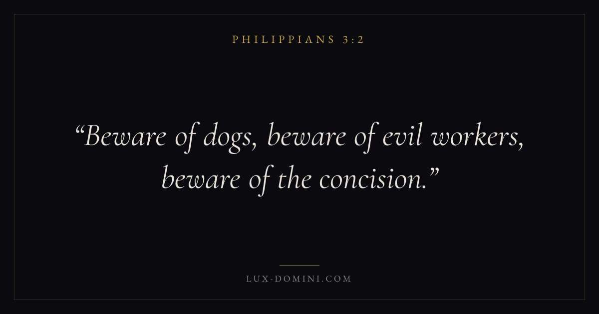 Books / Philippians / Chapter 3 / Verse 2 ← Philippians 3:1 Philippians 3:2 Philippians 3:3 → Beware of dogs, beware of evil workers, beware of the concision. Download verse card Share on Twitter Share on Facebook Pin it ✦ Key themes HopeSuffering and trialsHumilityJoy Read with Philippians 3:3Romans 8:24Revelation 21:4Romans 8:18 Related topics Bible verses about hopeBible verses about suffering and trialsBible verses about humility ✦ Philippians Chapter 3 verses V. 1 V. 2 V. 3 V. 4 V. 5 V. 6 V. 7 V. 8 V. 9 V. 10 V. 11 V. 12 V. 13 V. 14 V. 15 V. 16 V. 17 V. 18 V. 19 V. 20 V. 21