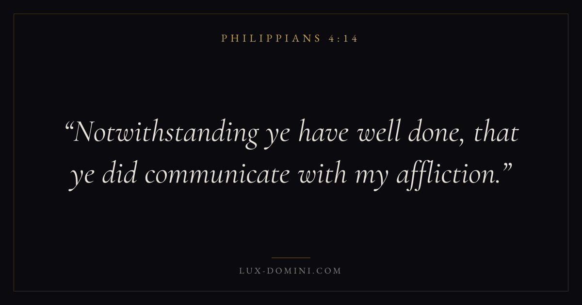 Books / Philippians / Chapter 4 / Verse 14 ← Philippians 4:13 Philippians 4:14 Philippians 4:15 → Notwithstanding ye have well done, that ye did communicate with my affliction. Download verse card Share on Twitter Share on Facebook Pin it ✦ Key themes HopeSuffering and trialsHumilityTruthJoy Read with Philippians 4:15Philippians 4:16Romans 8:24Revelation 21:4 Related topics Bible verses about hopeBible verses about suffering and trialsBible verses about humilityBible verses about truth ✦ Philippians Chapter 4 verses V. 1 V. 2 V. 3 V. 4 V. 5 V. 6 V. 7 V. 8 V. 9 V. 10 V. 11 V. 12 V. 13 V. 14 V. 15 V. 16 V. 17 V. 18 V. 19 V. 20 V. 21 V. 22 V. 23