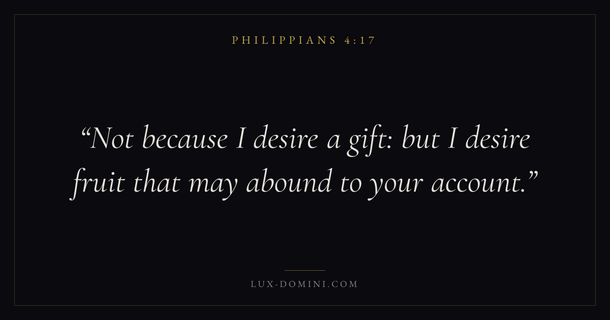 Books / Philippians / Chapter 4 / Verse 17 ← Philippians 4:16 Philippians 4:17 Philippians 4:18 → Not because I desire a gift: but I desire fruit that may abound to your account. Download verse card Share on Twitter Share on Facebook Pin it ✦ Key themes HopeSuffering and trialsGraceHumilityJoy Read with Philippians 4:18Philippians 4:19Romans 8:24Revelation 21:4 Related topics Bible verses about hopeBible verses about suffering and trialsBible verses about graceBible verses about humility ✦ Philippians Chapter 4 verses V. 1 V. 2 V. 3 V. 4 V. 5 V. 6 V. 7 V. 8 V. 9 V. 10 V. 11 V. 12 V. 13 V. 14 V. 15 V. 16 V. 17 V. 18 V. 19 V. 20 V. 21 V. 22 V. 23