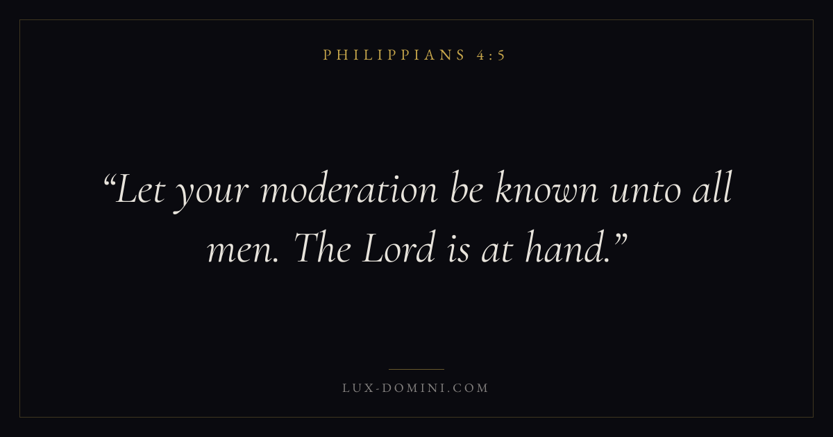 Let your moderation be known unto all men - That is, let it be such that others may see it. This does not mean that they were to make an ostentatious display of it, but that it should be such a characteristic of their lives that it would be constantly visible to others. The word "moderation" - επιεικες epieikes - refers to restraint on the passions, general soberness of living, being free from all excesses. The word properly means that which is fit or suitable, and then propriety, gentleness, mildness - They were to indulge in no excess of passion, or dress, or eating, or drinking.
