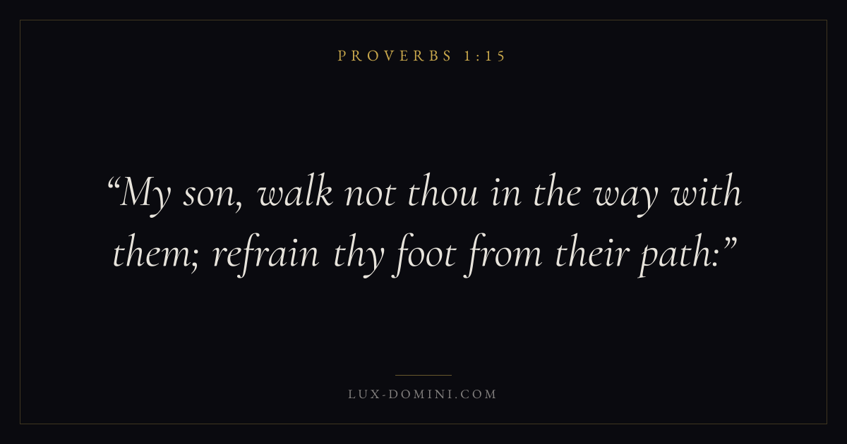 Books / Proverbs / Chapter 1 / Verse 15 ← Proverbs 1:14 Proverbs 1:15 Proverbs 1:16 → My son, walk not thou in the way with them; refrain thy foot from their path: Download verse card Share on Twitter Share on Facebook Pin it ✦ Key themes LoveAnxiety and fearWisdomJustice and mercyFear of the Lord Read with Proverbs 1:11Proverbs 1:12John 3:161 Corinthians 13:4 Related topics Bible verses about loveBible verses about anxiety and fearBible verses about wisdomBible verses about justice and mercy ✦ Proverbs Chapter 1 verses V. 1 V. 2 V. 3 V. 4 V. 5 V. 6 V. 7 V. 8 V. 9 V. 10 V. 11 V. 12 V. 13 V. 14 V. 15 V. 16 V. 17 V. 18 V. 19 V. 20 V. 21 V. 22 V. 23 V. 24 V. 25 V. 26 V. 27 V. 28 V. 29 V. 30 V. 31 V. 32 V. 33