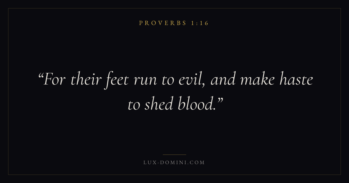 Books / Proverbs / Chapter 1 / Verse 16 ← Proverbs 1:15 Proverbs 1:16 Proverbs 1:17 → For their feet run to evil, and make haste to shed blood. Download verse card Share on Twitter Share on Facebook Pin it ✦ Key themes LoveAnxiety and fearWisdomJustice and mercyFear of the Lord Read with Proverbs 1:17Proverbs 1:18John 3:161 Corinthians 13:4 Related topics Bible verses about loveBible verses about anxiety and fearBible verses about wisdomBible verses about justice and mercy ✦ Proverbs Chapter 1 verses V. 1 V. 2 V. 3 V. 4 V. 5 V. 6 V. 7 V. 8 V. 9 V. 10 V. 11 V. 12 V. 13 V. 14 V. 15 V. 16 V. 17 V. 18 V. 19 V. 20 V. 21 V. 22 V. 23 V. 24 V. 25 V. 26 V. 27 V. 28 V. 29 V. 30 V. 31 V. 32 V. 33