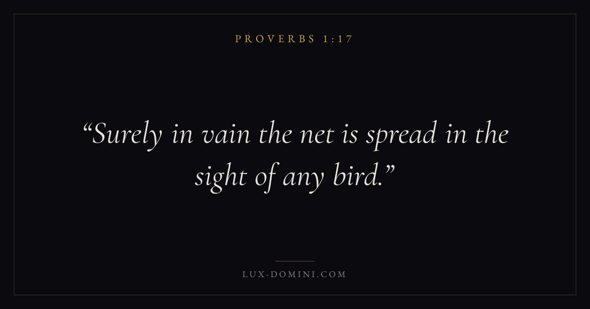 Books / Proverbs / Chapter 1 / Verse 17 ← Proverbs 1:16 Proverbs 1:17 Proverbs 1:18 → Surely in vain the net is spread in the sight of any bird. Download verse card Share on Twitter Share on Facebook Pin it ✦ Key themes LoveAnxiety and fearWisdomJustice and mercyFear of the Lord Read with Proverbs 1:16Proverbs 1:18John 3:161 Corinthians 13:4 Related topics Bible verses about loveBible verses about anxiety and fearBible verses about wisdomBible verses about justice and mercy ✦ Proverbs Chapter 1 verses V. 1 V. 2 V. 3 V. 4 V. 5 V. 6 V. 7 V. 8 V. 9 V. 10 V. 11 V. 12 V. 13 V. 14 V. 15 V. 16 V. 17 V. 18 V. 19 V. 20 V. 21 V. 22 V. 23 V. 24 V. 25 V. 26 V. 27 V. 28 V. 29 V. 30 V. 31 V. 32 V. 33