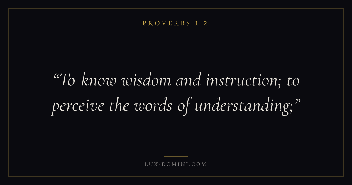 Books / Proverbs / Chapter 1 / Verse 2 ← Proverbs 1:1 Proverbs 1:2 Proverbs 1:3 → To know wisdom and instruction; to perceive the words of understanding; Download verse card Share on Twitter Share on Facebook Pin it ✦ Key themes Anxiety and fearWisdomJustice and mercyFear of the Lord Read with Proverbs 1:1Proverbs 1:3Philippians 4:6Isaiah 41:10 Related topics Bible verses about anxiety and fearBible verses about wisdomBible verses about justice and mercy ✦ Proverbs Chapter 1 verses V. 1 V. 2 V. 3 V. 4 V. 5 V. 6 V. 7 V. 8 V. 9 V. 10 V. 11 V. 12 V. 13 V. 14 V. 15 V. 16 V. 17 V. 18 V. 19 V. 20 V. 21 V. 22 V. 23 V. 24 V. 25 V. 26 V. 27 V. 28 V. 29 V. 30 V. 31 V. 32 V. 33