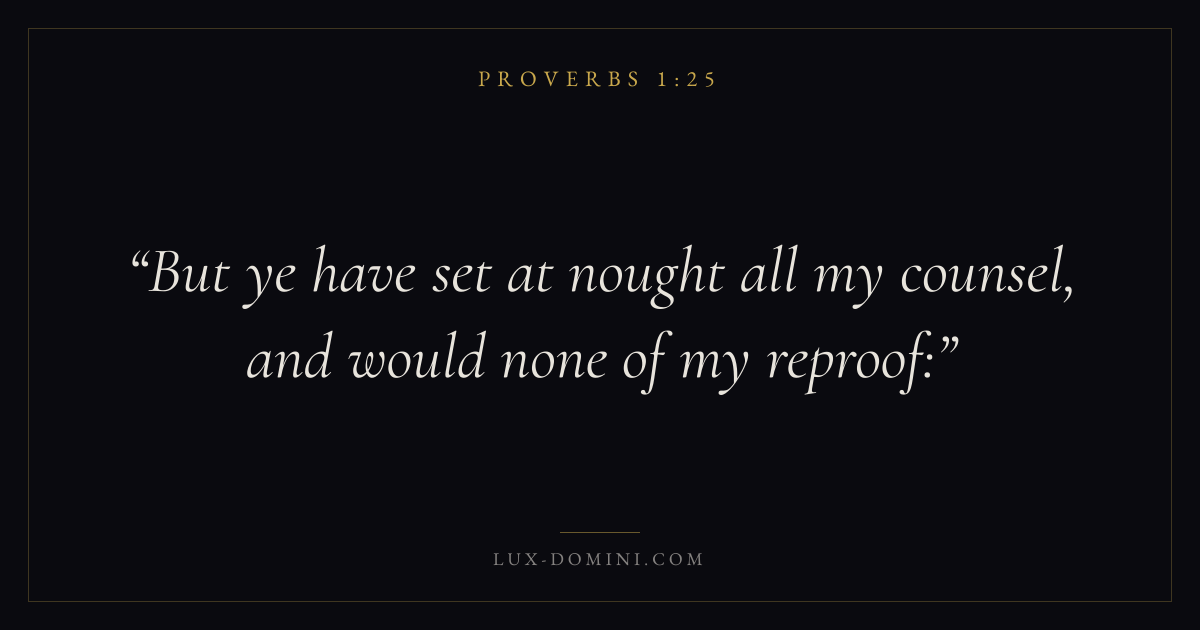 Books / Proverbs / Chapter 1 / Verse 25 ← Proverbs 1:24 Proverbs 1:25 Proverbs 1:26 → But ye have set at nought all my counsel, and would none of my reproof: Download verse card Share on Twitter Share on Facebook Pin it ✦ Key themes Anxiety and fearWisdomJustice and mercyFear of the Lord Read with Proverbs 1:24Proverbs 1:26Philippians 4:6Isaiah 41:10 Related topics Bible verses about anxiety and fearBible verses about wisdomBible verses about justice and mercy ✦ Proverbs Chapter 1 verses V. 1 V. 2 V. 3 V. 4 V. 5 V. 6 V. 7 V. 8 V. 9 V. 10 V. 11 V. 12 V. 13 V. 14 V. 15 V. 16 V. 17 V. 18 V. 19 V. 20 V. 21 V. 22 V. 23 V. 24 V. 25 V. 26 V. 27 V. 28 V. 29 V. 30 V. 31 V. 32 V. 33