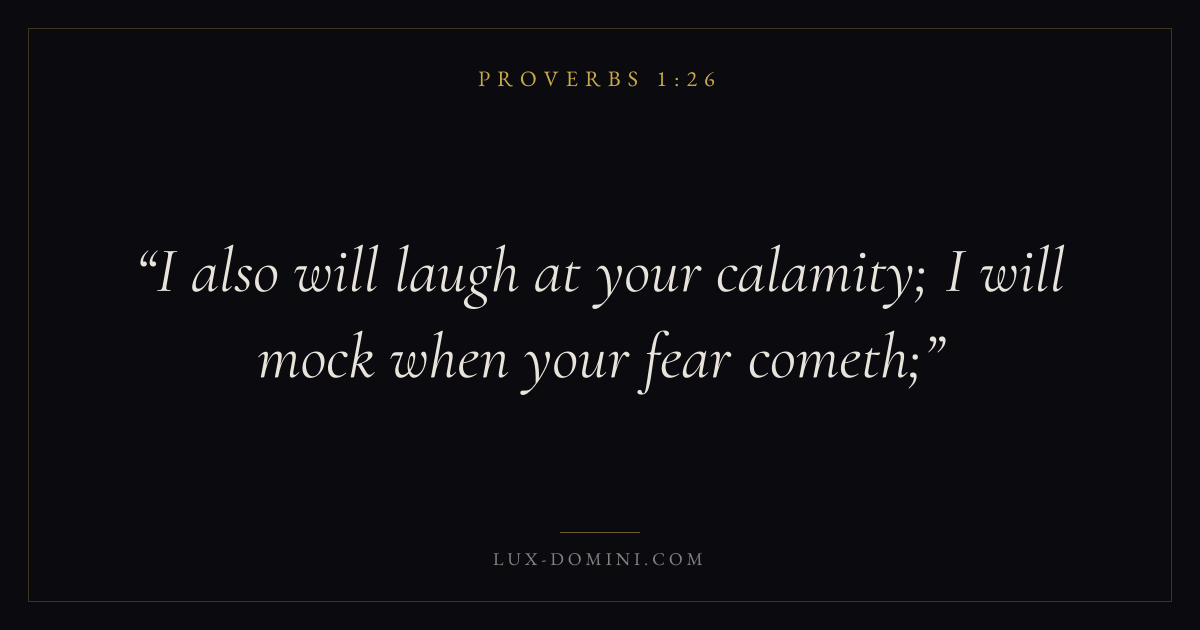 Books / Proverbs / Chapter 1 / Verse 26 ← Proverbs 1:25 Proverbs 1:26 Proverbs 1:27 → I also will laugh at your calamity; I will mock when your fear cometh; Download verse card Share on Twitter Share on Facebook Pin it ✦ Key themes Anxiety and fearWisdomJustice and mercyFear of the Lord Read with Proverbs 1:24Proverbs 1:25Philippians 4:6Isaiah 41:10 Related topics Bible verses about anxiety and fearBible verses about wisdomBible verses about justice and mercy ✦ Proverbs Chapter 1 verses V. 1 V. 2 V. 3 V. 4 V. 5 V. 6 V. 7 V. 8 V. 9 V. 10 V. 11 V. 12 V. 13 V. 14 V. 15 V. 16 V. 17 V. 18 V. 19 V. 20 V. 21 V. 22 V. 23 V. 24 V. 25 V. 26 V. 27 V. 28 V. 29 V. 30 V. 31 V. 32 V. 33