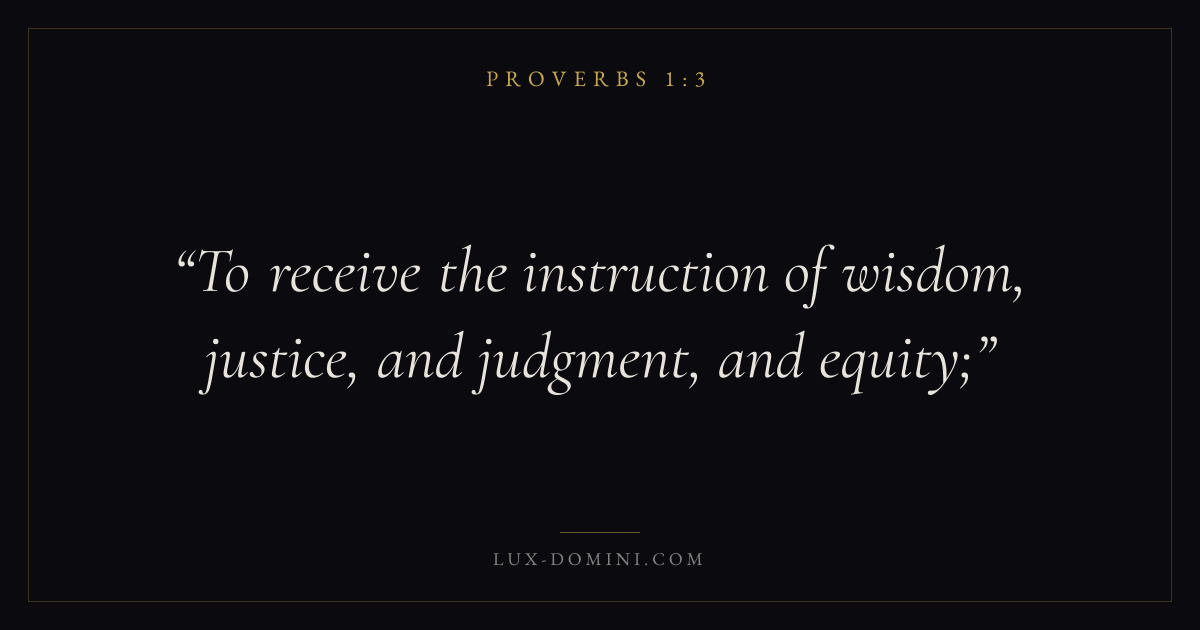 Books / Proverbs / Chapter 1 / Verse 3 ← Proverbs 1:2 Proverbs 1:3 Proverbs 1:4 → To receive the instruction of wisdom, justice, and judgment, and equity; Download verse card Share on Twitter Share on Facebook Pin it ✦ Key themes Anxiety and fearWisdomJustice and mercyFear of the Lord Read with Proverbs 1:1Proverbs 1:2Philippians 4:6Isaiah 41:10 Related topics Bible verses about anxiety and fearBible verses about wisdomBible verses about justice and mercy ✦ Proverbs Chapter 1 verses V. 1 V. 2 V. 3 V. 4 V. 5 V. 6 V. 7 V. 8 V. 9 V. 10 V. 11 V. 12 V. 13 V. 14 V. 15 V. 16 V. 17 V. 18 V. 19 V. 20 V. 21 V. 22 V. 23 V. 24 V. 25 V. 26 V. 27 V. 28 V. 29 V. 30 V. 31 V. 32 V. 33