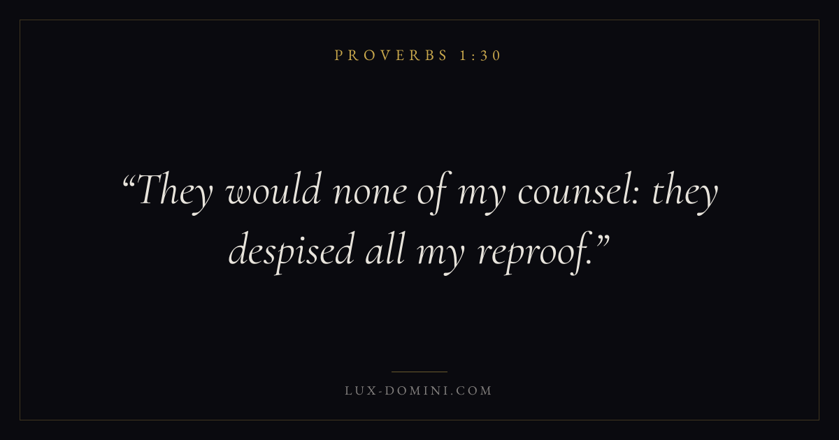 Books / Proverbs / Chapter 1 / Verse 30 ← Proverbs 1:29 Proverbs 1:30 Proverbs 1:31 → They would none of my counsel: they despised all my reproof. Download verse card Share on Twitter Share on Facebook Pin it ✦ Key themes Anxiety and fearWisdomJustice and mercyFear of the Lord Read with Proverbs 1:29Proverbs 1:31Philippians 4:6Isaiah 41:10 Related topics Bible verses about anxiety and fearBible verses about wisdomBible verses about justice and mercy ✦ Proverbs Chapter 1 verses V. 1 V. 2 V. 3 V. 4 V. 5 V. 6 V. 7 V. 8 V. 9 V. 10 V. 11 V. 12 V. 13 V. 14 V. 15 V. 16 V. 17 V. 18 V. 19 V. 20 V. 21 V. 22 V. 23 V. 24 V. 25 V. 26 V. 27 V. 28 V. 29 V. 30 V. 31 V. 32 V. 33