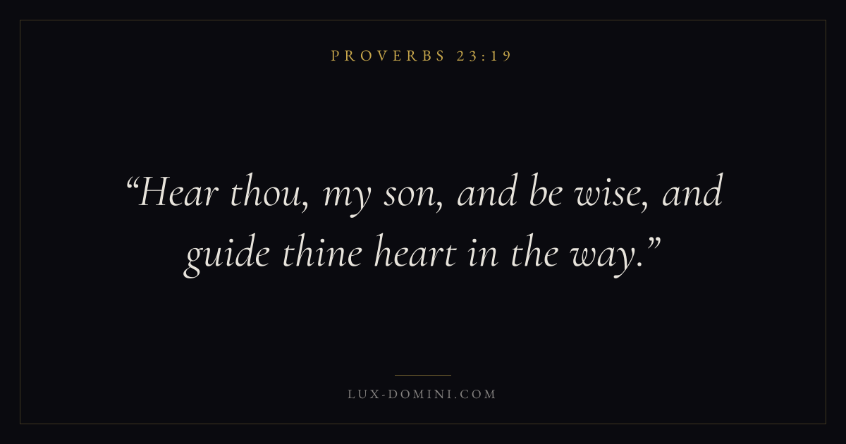 Books / Proverbs / Chapter 23 / Verse 19 ← Proverbs 23:18 Proverbs 23:19 Proverbs 23:20 → Hear thou, my son, and be wise, and guide thine heart in the way. Download verse card Share on Twitter Share on Facebook Pin it ✦ Key themes Anxiety and fearWisdomJustice and mercyForgivenessFear of the Lord Read with Proverbs 23:20Proverbs 23:21Philippians 4:6Isaiah 41:10 Related topics Bible verses about anxiety and fearBible verses about wisdomBible verses about justice and mercyBible verses about forgiveness ✦ Proverbs Chapter 23 verses V. 1 V. 2 V. 3 V. 4 V. 5 V. 6 V. 7 V. 8 V. 9 V. 10 V. 11 V. 12 V. 13 V. 14 V. 15 V. 16 V. 17 V. 18 V. 19 V. 20 V. 21 V. 22 V. 23 V. 24 V. 25 V. 26 V. 27 V. 28 V. 29 V. 30 V. 31 V. 32 V. 33 V. 34 V. 35