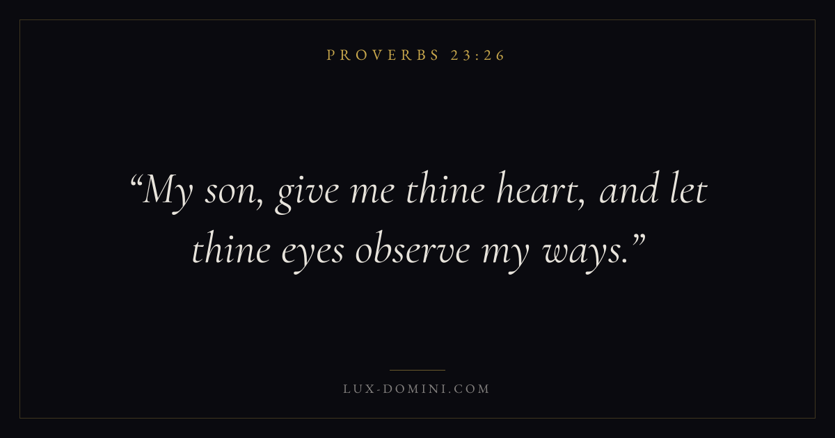 Books / Proverbs / Chapter 23 / Verse 26 ← Proverbs 23:25 Proverbs 23:26 Proverbs 23:27 → My son, give me thine heart, and let thine eyes observe my ways. Download verse card Share on Twitter Share on Facebook Pin it ✦ Key themes Anxiety and fearWisdomJustice and mercyForgivenessFear of the Lord Read with Proverbs 23:27Proverbs 23:28Philippians 4:6Isaiah 41:10 Related topics Bible verses about anxiety and fearBible verses about wisdomBible verses about justice and mercyBible verses about forgiveness ✦ Proverbs Chapter 23 verses V. 1 V. 2 V. 3 V. 4 V. 5 V. 6 V. 7 V. 8 V. 9 V. 10 V. 11 V. 12 V. 13 V. 14 V. 15 V. 16 V. 17 V. 18 V. 19 V. 20 V. 21 V. 22 V. 23 V. 24 V. 25 V. 26 V. 27 V. 28 V. 29 V. 30 V. 31 V. 32 V. 33 V. 34 V. 35