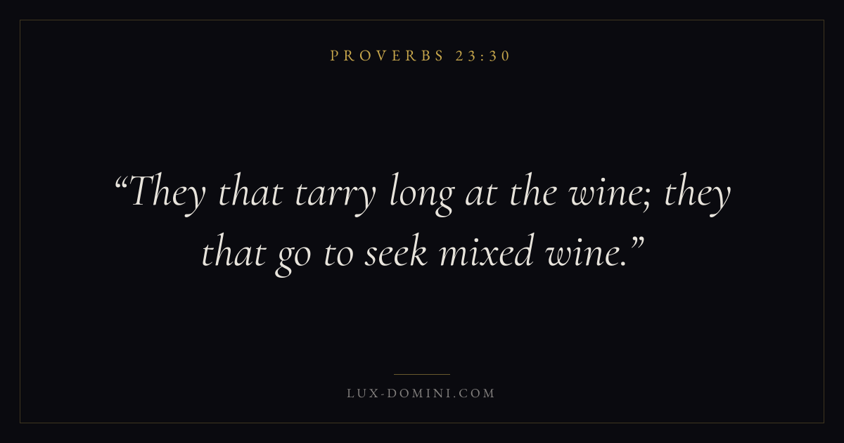 Books / Proverbs / Chapter 23 / Verse 30 ← Proverbs 23:29 Proverbs 23:30 Proverbs 23:31 → They that tarry long at the wine; they that go to seek mixed wine. Download verse card Share on Twitter Share on Facebook Pin it ✦ Key themes Anxiety and fearWisdomJustice and mercyFear of the Lord Read with Proverbs 23:29Philippians 4:6Isaiah 41:10Proverbs 1:7 Related topics Bible verses about anxiety and fearBible verses about wisdomBible verses about justice and mercy ✦ Proverbs Chapter 23 verses V. 1 V. 2 V. 3 V. 4 V. 5 V. 6 V. 7 V. 8 V. 9 V. 10 V. 11 V. 12 V. 13 V. 14 V. 15 V. 16 V. 17 V. 18 V. 19 V. 20 V. 21 V. 22 V. 23 V. 24 V. 25 V. 26 V. 27 V. 28 V. 29 V. 30 V. 31 V. 32 V. 33 V. 34 V. 35