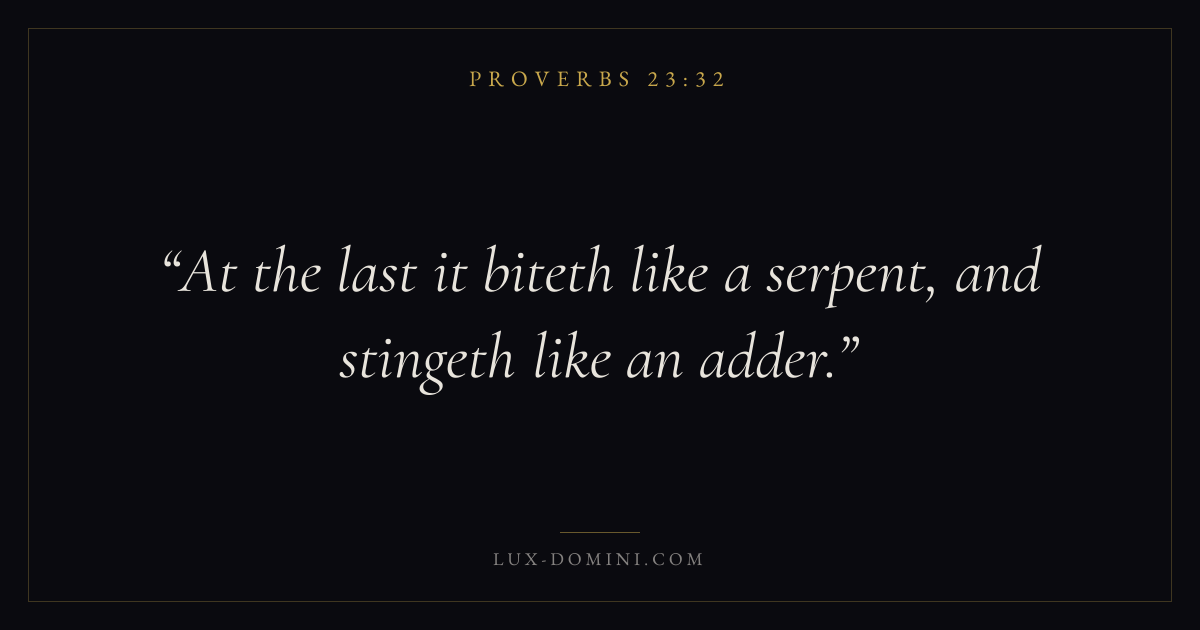 Books / Proverbs / Chapter 23 / Verse 32 ← Proverbs 23:31 Proverbs 23:32 Proverbs 23:33 → At the last it biteth like a serpent, and stingeth like an adder. Download verse card Share on Twitter Share on Facebook Pin it ✦ Key themes Anxiety and fearWisdomJustice and mercyFear of the Lord Read with Proverbs 23:31Philippians 4:6Isaiah 41:10Proverbs 1:7 Related topics Bible verses about anxiety and fearBible verses about wisdomBible verses about justice and mercy ✦ Proverbs Chapter 23 verses V. 1 V. 2 V. 3 V. 4 V. 5 V. 6 V. 7 V. 8 V. 9 V. 10 V. 11 V. 12 V. 13 V. 14 V. 15 V. 16 V. 17 V. 18 V. 19 V. 20 V. 21 V. 22 V. 23 V. 24 V. 25 V. 26 V. 27 V. 28 V. 29 V. 30 V. 31 V. 32 V. 33 V. 34 V. 35