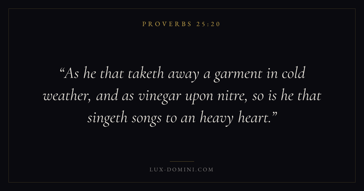 As he that taketh away a garment in cold weather, and as vinegar upon nitre, so is he that singeth songs to an heavy heart.