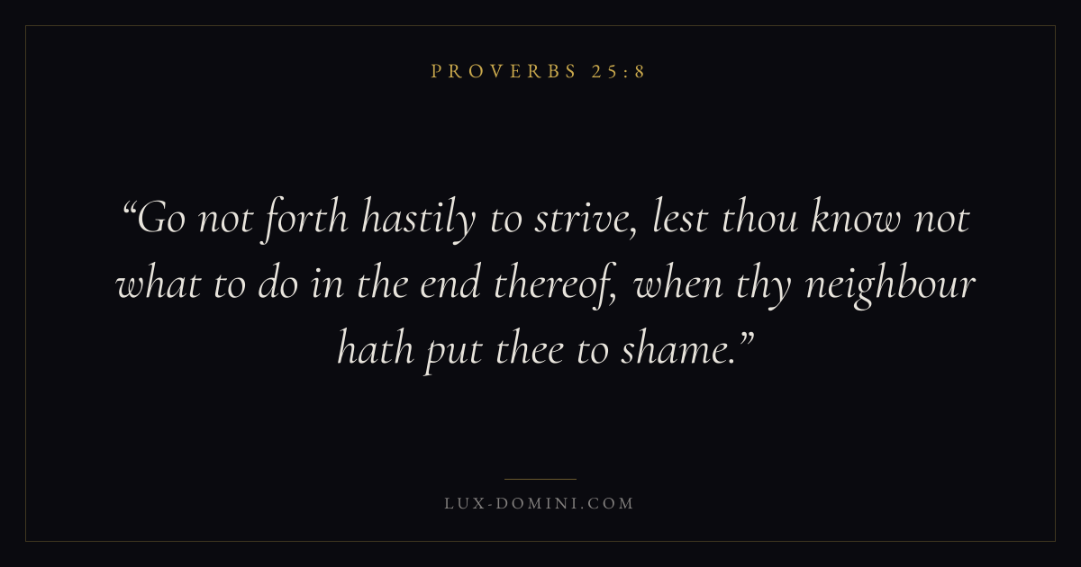 Go not forth hastily to strive, lest thou know not what to do in the end thereof, when thy neighbour hath put thee to shame.