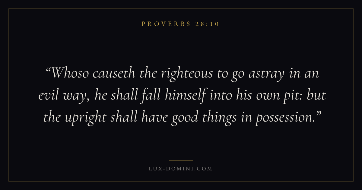 Whoso causeth the righteous to go astray in an evil way, he shall fall himself into his own pit: but the upright shall have good things in possession.