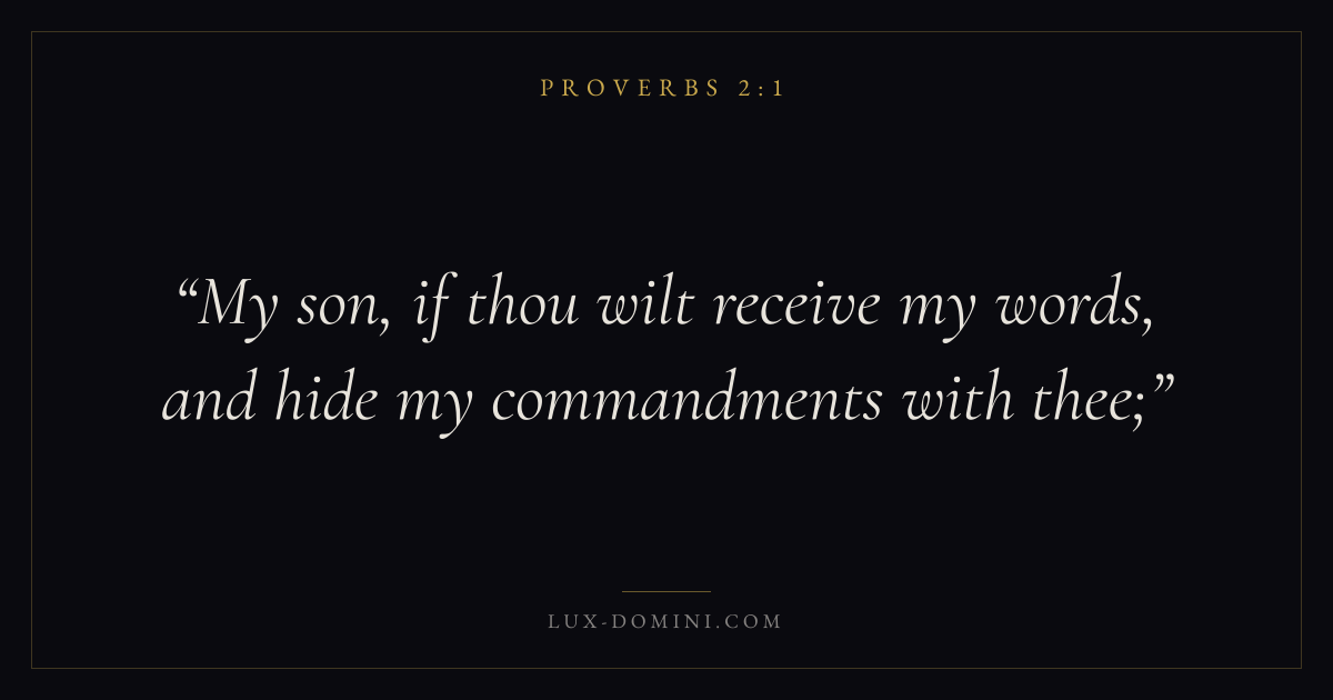 Books / Proverbs / Chapter 2 / Verse 1 ← Proverbs 1:33 Proverbs 2:1 Proverbs 2:2 → My son, if thou wilt receive my words, and hide my commandments with thee; Download verse card Share on Twitter Share on Facebook Pin it ✦ Key themes Anxiety and fearPrayerWisdomJustice and mercyFear of the Lord Read with Proverbs 2:2Proverbs 2:3Philippians 4:6Isaiah 41:10 Related topics Bible verses about anxiety and fearBible verses about prayerBible verses about wisdomBible verses about justice and mercy ✦ Proverbs Chapter 2 verses V. 1 V. 2 V. 3 V. 4 V. 5 V. 6 V. 7 V. 8 V. 9 V. 10 V. 11 V. 12 V. 13 V. 14 V. 15 V. 16 V. 17 V. 18 V. 19 V. 20 V. 21 V. 22
