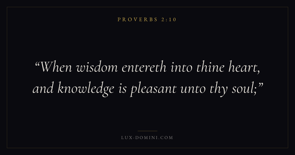 Books / Proverbs / Chapter 2 / Verse 10 ← Proverbs 2:9 Proverbs 2:10 Proverbs 2:11 → When wisdom entereth into thine heart, and knowledge is pleasant unto thy soul; Download verse card Share on Twitter Share on Facebook Pin it ✦ Key themes Anxiety and fearWisdomJustice and mercyFear of the Lord Read with Proverbs 2:11Proverbs 2:12Philippians 4:6Isaiah 41:10 Related topics Bible verses about anxiety and fearBible verses about wisdomBible verses about justice and mercy ✦ Proverbs Chapter 2 verses V. 1 V. 2 V. 3 V. 4 V. 5 V. 6 V. 7 V. 8 V. 9 V. 10 V. 11 V. 12 V. 13 V. 14 V. 15 V. 16 V. 17 V. 18 V. 19 V. 20 V. 21 V. 22