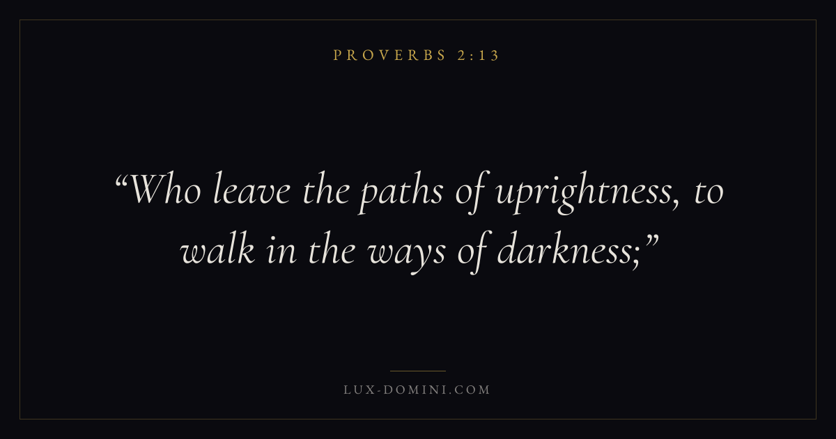 Books / Proverbs / Chapter 2 / Verse 13 ← Proverbs 2:12 Proverbs 2:13 Proverbs 2:14 → Who leave the paths of uprightness, to walk in the ways of darkness; Download verse card Share on Twitter Share on Facebook Pin it ✦ Key themes Anxiety and fearWisdomJustice and mercyFear of the Lord Read with Proverbs 2:10Proverbs 2:11Philippians 4:6Isaiah 41:10 Related topics Bible verses about anxiety and fearBible verses about wisdomBible verses about justice and mercy ✦ Proverbs Chapter 2 verses V. 1 V. 2 V. 3 V. 4 V. 5 V. 6 V. 7 V. 8 V. 9 V. 10 V. 11 V. 12 V. 13 V. 14 V. 15 V. 16 V. 17 V. 18 V. 19 V. 20 V. 21 V. 22