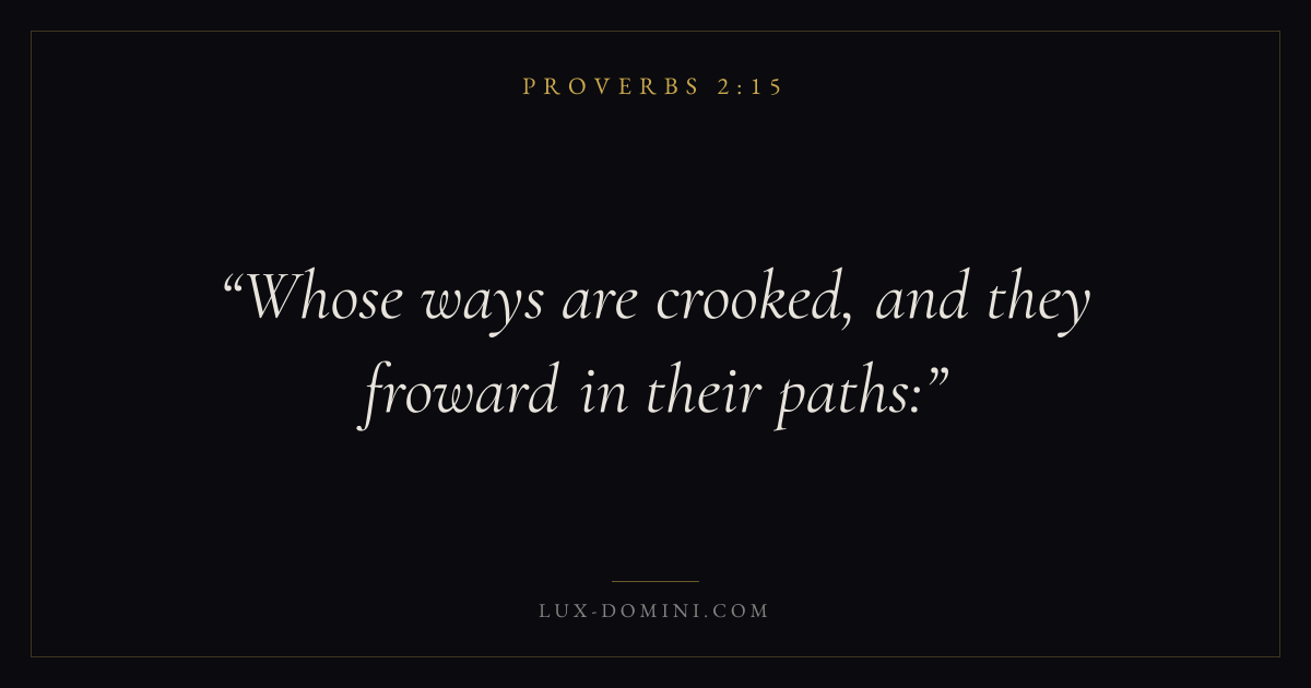 Books / Proverbs / Chapter 2 / Verse 15 ← Proverbs 2:14 Proverbs 2:15 Proverbs 2:16 → Whose ways are crooked, and they froward in their paths: Download verse card Share on Twitter Share on Facebook Pin it ✦ Key themes Anxiety and fearWisdomJustice and mercyFear of the Lord Read with Proverbs 2:16Proverbs 2:17Philippians 4:6Isaiah 41:10 Related topics Bible verses about anxiety and fearBible verses about wisdomBible verses about justice and mercy ✦ Proverbs Chapter 2 verses V. 1 V. 2 V. 3 V. 4 V. 5 V. 6 V. 7 V. 8 V. 9 V. 10 V. 11 V. 12 V. 13 V. 14 V. 15 V. 16 V. 17 V. 18 V. 19 V. 20 V. 21 V. 22