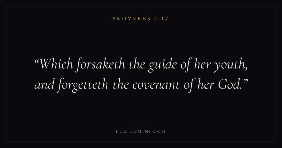Books / Proverbs / Chapter 2 / Verse 17 ← Proverbs 2:16 Proverbs 2:17 Proverbs 2:18 → Which forsaketh the guide of her youth, and forgetteth the covenant of her God. Download verse card Share on Twitter Share on Facebook Pin it ✦ Key themes Anxiety and fearWisdomJustice and mercyFear of the Lord Read with Proverbs 2:15Proverbs 2:16Philippians 4:6Isaiah 41:10 Related topics Bible verses about anxiety and fearBible verses about wisdomBible verses about justice and mercy ✦ Proverbs Chapter 2 verses V. 1 V. 2 V. 3 V. 4 V. 5 V. 6 V. 7 V. 8 V. 9 V. 10 V. 11 V. 12 V. 13 V. 14 V. 15 V. 16 V. 17 V. 18 V. 19 V. 20 V. 21 V. 22