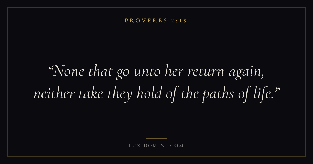 Books / Proverbs / Chapter 2 / Verse 19 ← Proverbs 2:18 Proverbs 2:19 Proverbs 2:20 → None that go unto her return again, neither take they hold of the paths of life. Download verse card Share on Twitter Share on Facebook Pin it ✦ Key themes Anxiety and fearWisdomJustice and mercyFear of the Lord Read with Proverbs 2:20Proverbs 2:21Philippians 4:6Isaiah 41:10 Related topics Bible verses about anxiety and fearBible verses about wisdomBible verses about justice and mercy ✦ Proverbs Chapter 2 verses V. 1 V. 2 V. 3 V. 4 V. 5 V. 6 V. 7 V. 8 V. 9 V. 10 V. 11 V. 12 V. 13 V. 14 V. 15 V. 16 V. 17 V. 18 V. 19 V. 20 V. 21 V. 22
