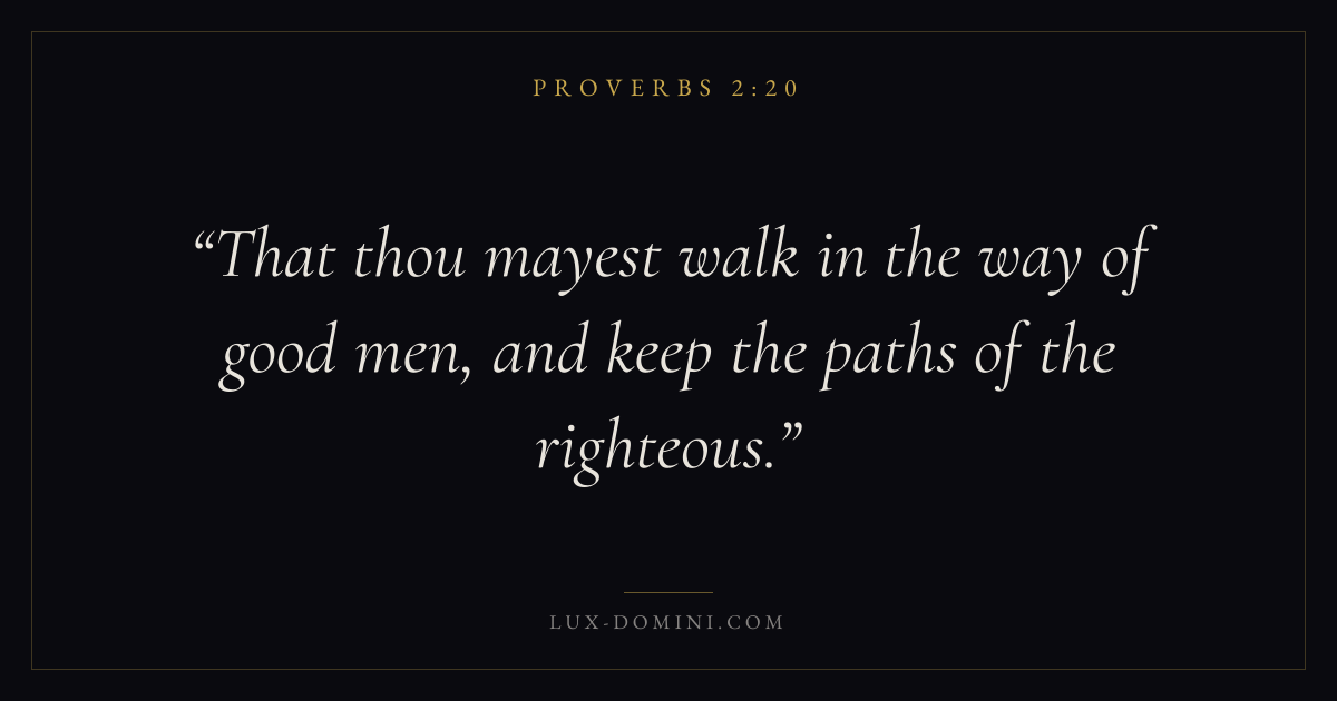 Books / Proverbs / Chapter 2 / Verse 20 ← Proverbs 2:19 Proverbs 2:20 Proverbs 2:21 → That thou mayest walk in the way of good men, and keep the paths of the righteous. Download verse card Share on Twitter Share on Facebook Pin it ✦ Key themes Anxiety and fearWisdomJustice and mercyFear of the Lord Read with Proverbs 2:19Proverbs 2:21Philippians 4:6Isaiah 41:10 Related topics Bible verses about anxiety and fearBible verses about wisdomBible verses about justice and mercy ✦ Proverbs Chapter 2 verses V. 1 V. 2 V. 3 V. 4 V. 5 V. 6 V. 7 V. 8 V. 9 V. 10 V. 11 V. 12 V. 13 V. 14 V. 15 V. 16 V. 17 V. 18 V. 19 V. 20 V. 21 V. 22