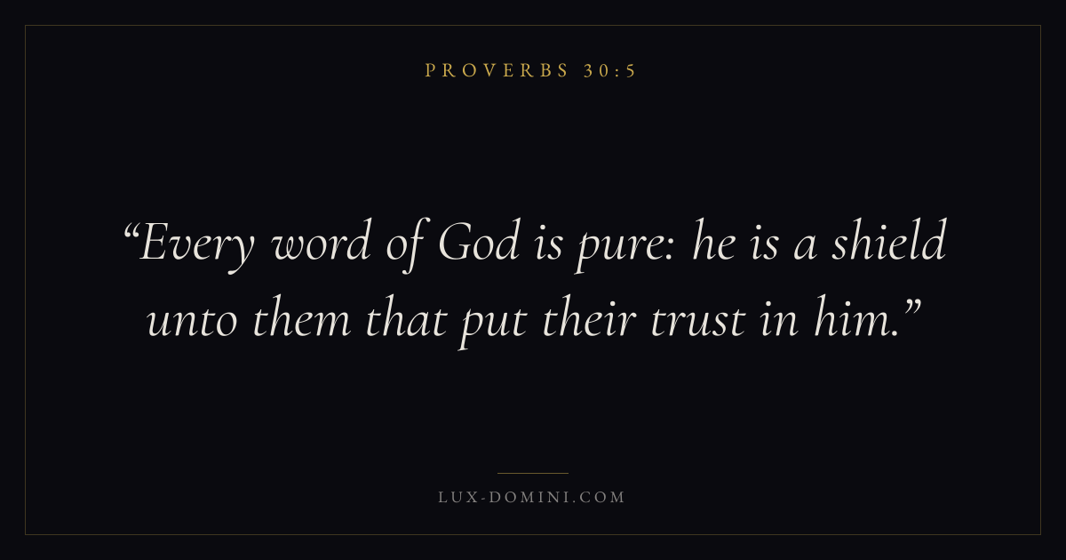 Books / Proverbs / Chapter 30 / Verse 5 ← Proverbs 30:4 Proverbs 30:5 Proverbs 30:6 → Every word of God is pure: he is a shield unto them that put their trust in him. Download verse card Share on Twitter Share on Facebook Pin it ✦ Key themes FaithAnxiety and fearWisdomJustice and mercyFear of the Lord Read with Proverbs 30:6Hebrews 11:1Romans 10:17Philippians 4:6 Related topics Bible verses about faithBible verses about anxiety and fearBible verses about wisdomBible verses about justice and mercy ✦ Proverbs Chapter 30 verses V. 1 V. 2 V. 3 V. 4 V. 5 V. 6 V. 7 V. 8 V. 9 V. 10 V. 11 V. 12 V. 13 V. 14 V. 15 V. 16 V. 17 V. 18 V. 19 V. 20 V. 21 V. 22 V. 23 V. 24 V. 25 V. 26 V. 27 V. 28 V. 29 V. 30 V. 31 V. 32 V. 33