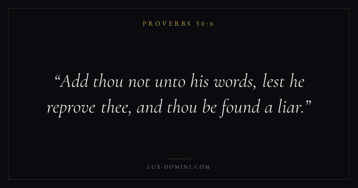 Books / Proverbs / Chapter 30 / Verse 6 ← Proverbs 30:5 Proverbs 30:6 Proverbs 30:7 → Add thou not unto his words, lest he reprove thee, and thou be found a liar. Download verse card Share on Twitter Share on Facebook Pin it ✦ Key themes Anxiety and fearWisdomJustice and mercyFear of the Lord Read with Proverbs 30:5Philippians 4:6Isaiah 41:10Proverbs 1:7 Related topics Bible verses about anxiety and fearBible verses about wisdomBible verses about justice and mercy ✦ Proverbs Chapter 30 verses V. 1 V. 2 V. 3 V. 4 V. 5 V. 6 V. 7 V. 8 V. 9 V. 10 V. 11 V. 12 V. 13 V. 14 V. 15 V. 16 V. 17 V. 18 V. 19 V. 20 V. 21 V. 22 V. 23 V. 24 V. 25 V. 26 V. 27 V. 28 V. 29 V. 30 V. 31 V. 32 V. 33