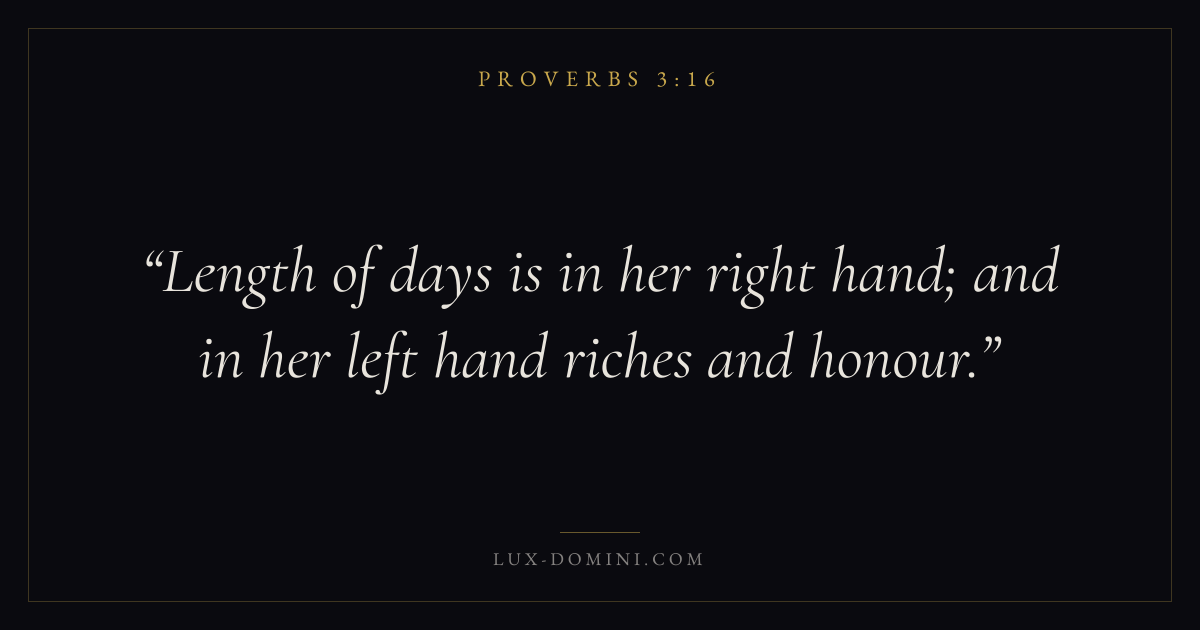 Length of days is in her right hand; and in her left hand riches and honour.