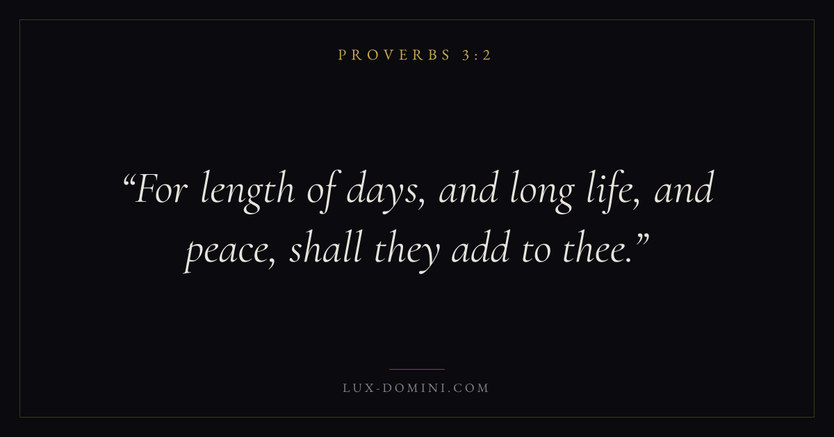 Books / Proverbs / Chapter 3 / Verse 2 ← Proverbs 3:1 Proverbs 3:2 Proverbs 3:3 → For length of days, and long life, and peace, shall they add to thee. Download verse card Share on Twitter Share on Facebook Pin it ✦ Key themes Anxiety and fearWisdomJustice and mercyPeaceFear of the Lord Read with Proverbs 3:1Proverbs 3:3Philippians 4:6Isaiah 41:10 Related topics Bible verses about anxiety and fearBible verses about wisdomBible verses about justice and mercyBible verses about peace ✦ Proverbs Chapter 3 verses V. 1 V. 2 V. 3 V. 4 V. 5 V. 6 V. 7 V. 8 V. 9 V. 10 V. 11 V. 12 V. 13 V. 14 V. 15 V. 16 V. 17 V. 18 V. 19 V. 20 V. 21 V. 22 V. 23 V. 24 V. 25 V. 26 V. 27 V. 28 V. 29 V. 30 V. 31 V. 32 V. 33 V. 34 V. 35
