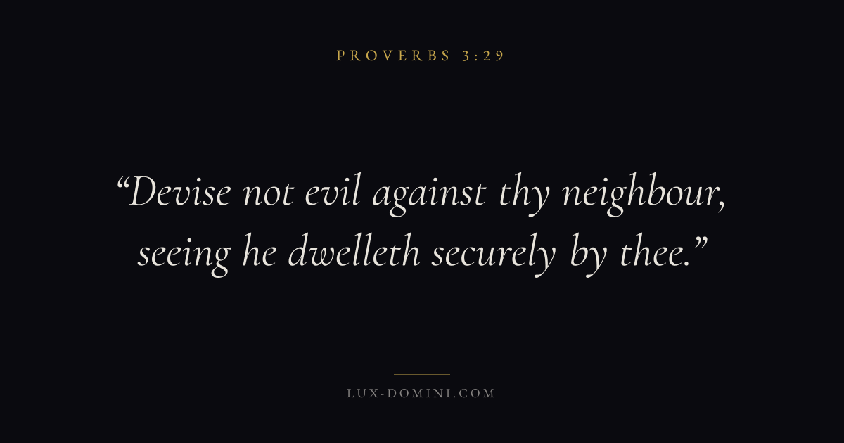 Books / Proverbs / Chapter 3 / Verse 29 ← Proverbs 3:28 Proverbs 3:29 Proverbs 3:30 → Devise not evil against thy neighbour, seeing he dwelleth securely by thee. Download verse card Share on Twitter Share on Facebook Pin it ✦ Key themes LoveAnxiety and fearWisdomJustice and mercyFear of the Lord Read with Proverbs 3:27Proverbs 3:28John 3:161 Corinthians 13:4 Related topics Bible verses about loveBible verses about anxiety and fearBible verses about wisdomBible verses about justice and mercy ✦ Proverbs Chapter 3 verses V. 1 V. 2 V. 3 V. 4 V. 5 V. 6 V. 7 V. 8 V. 9 V. 10 V. 11 V. 12 V. 13 V. 14 V. 15 V. 16 V. 17 V. 18 V. 19 V. 20 V. 21 V. 22 V. 23 V. 24 V. 25 V. 26 V. 27 V. 28 V. 29 V. 30 V. 31 V. 32 V. 33 V. 34 V. 35