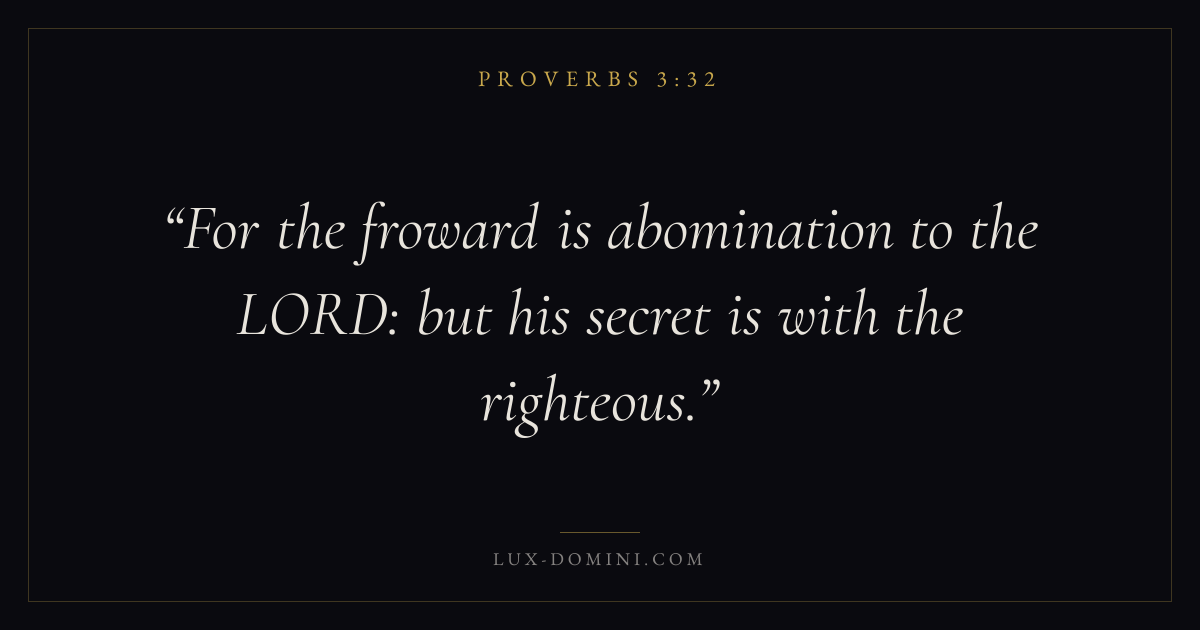 Books / Proverbs / Chapter 3 / Verse 32 ← Proverbs 3:31 Proverbs 3:32 Proverbs 3:33 → For the froward is abomination to the LORD: but his secret is with the righteous. Download verse card Share on Twitter Share on Facebook Pin it ✦ Key themes LoveAnxiety and fearWisdomJustice and mercyFear of the Lord Read with Proverbs 3:31John 3:161 Corinthians 13:4Philippians 4:6 Related topics Bible verses about loveBible verses about anxiety and fearBible verses about wisdomBible verses about justice and mercy ✦ Proverbs Chapter 3 verses V. 1 V. 2 V. 3 V. 4 V. 5 V. 6 V. 7 V. 8 V. 9 V. 10 V. 11 V. 12 V. 13 V. 14 V. 15 V. 16 V. 17 V. 18 V. 19 V. 20 V. 21 V. 22 V. 23 V. 24 V. 25 V. 26 V. 27 V. 28 V. 29 V. 30 V. 31 V. 32 V. 33 V. 34 V. 35