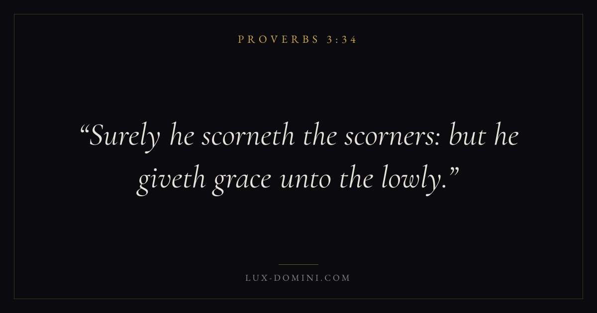 Books / Proverbs / Chapter 3 / Verse 34 ← Proverbs 3:33 Proverbs 3:34 Proverbs 3:35 → Surely he scorneth the scorners: but he giveth grace unto the lowly. Download verse card Share on Twitter Share on Facebook Pin it ✦ Key themes LoveAnxiety and fearWisdomJustice and mercyFear of the Lord Read with Proverbs 3:33Proverbs 3:35John 3:161 Corinthians 13:4 Related topics Bible verses about loveBible verses about anxiety and fearBible verses about wisdomBible verses about justice and mercy ✦ Proverbs Chapter 3 verses V. 1 V. 2 V. 3 V. 4 V. 5 V. 6 V. 7 V. 8 V. 9 V. 10 V. 11 V. 12 V. 13 V. 14 V. 15 V. 16 V. 17 V. 18 V. 19 V. 20 V. 21 V. 22 V. 23 V. 24 V. 25 V. 26 V. 27 V. 28 V. 29 V. 30 V. 31 V. 32 V. 33 V. 34 V. 35