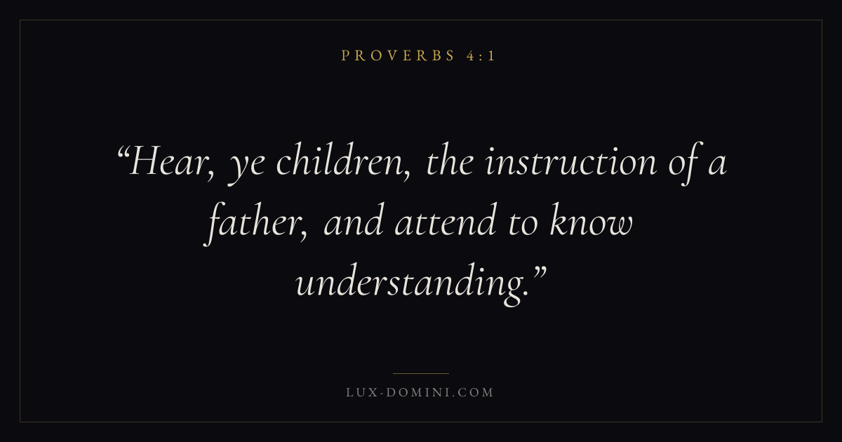 Books / Proverbs / Chapter 4 / Verse 1 ← Proverbs 3:35 Proverbs 4:1 Proverbs 4:2 → Hear, ye children, the instruction of a father, and attend to know understanding. Download verse card Share on Twitter Share on Facebook Pin it ✦ Key themes Anxiety and fearWisdomJustice and mercyFear of the Lord Read with Proverbs 4:2Proverbs 4:3Philippians 4:6Isaiah 41:10 Related topics Bible verses about anxiety and fearBible verses about wisdomBible verses about justice and mercy ✦ Proverbs Chapter 4 verses V. 1 V. 2 V. 3 V. 4 V. 5 V. 6 V. 7 V. 8 V. 9 V. 10 V. 11 V. 12 V. 13 V. 14 V. 15 V. 16 V. 17 V. 18 V. 19 V. 20 V. 21 V. 22 V. 23 V. 24 V. 25 V. 26 V. 27