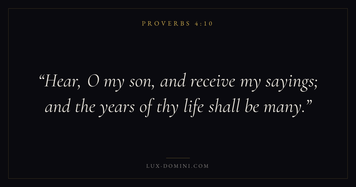 Books / Proverbs / Chapter 4 / Verse 10 ← Proverbs 4:9 Proverbs 4:10 Proverbs 4:11 → Hear, O my son, and receive my sayings; and the years of thy life shall be many. Download verse card Share on Twitter Share on Facebook Pin it ✦ Key themes Anxiety and fearWisdomJustice and mercyFear of the Lord Read with Proverbs 4:11Philippians 4:6Isaiah 41:10Proverbs 1:7 Related topics Bible verses about anxiety and fearBible verses about wisdomBible verses about justice and mercy ✦ Proverbs Chapter 4 verses V. 1 V. 2 V. 3 V. 4 V. 5 V. 6 V. 7 V. 8 V. 9 V. 10 V. 11 V. 12 V. 13 V. 14 V. 15 V. 16 V. 17 V. 18 V. 19 V. 20 V. 21 V. 22 V. 23 V. 24 V. 25 V. 26 V. 27
