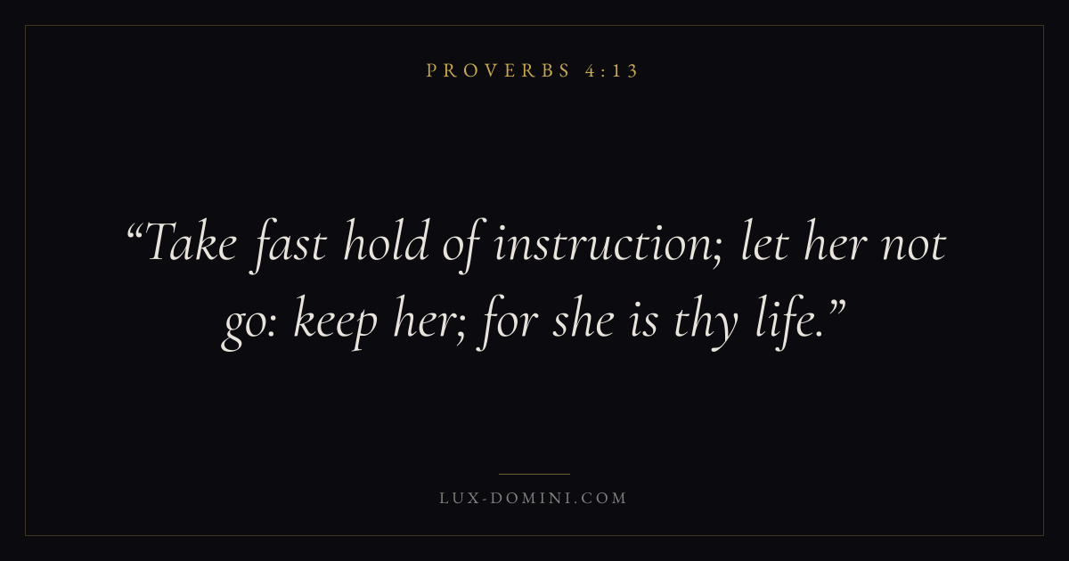 Books / Proverbs / Chapter 4 / Verse 13 ← Proverbs 4:12 Proverbs 4:13 Proverbs 4:14 → Take fast hold of instruction; let her not go: keep her; for she is thy life. Download verse card Share on Twitter Share on Facebook Pin it ✦ Key themes Anxiety and fearWisdomJustice and mercyFear of the Lord Read with Proverbs 4:12Philippians 4:6Isaiah 41:10Proverbs 1:7 Related topics Bible verses about anxiety and fearBible verses about wisdomBible verses about justice and mercy ✦ Proverbs Chapter 4 verses V. 1 V. 2 V. 3 V. 4 V. 5 V. 6 V. 7 V. 8 V. 9 V. 10 V. 11 V. 12 V. 13 V. 14 V. 15 V. 16 V. 17 V. 18 V. 19 V. 20 V. 21 V. 22 V. 23 V. 24 V. 25 V. 26 V. 27