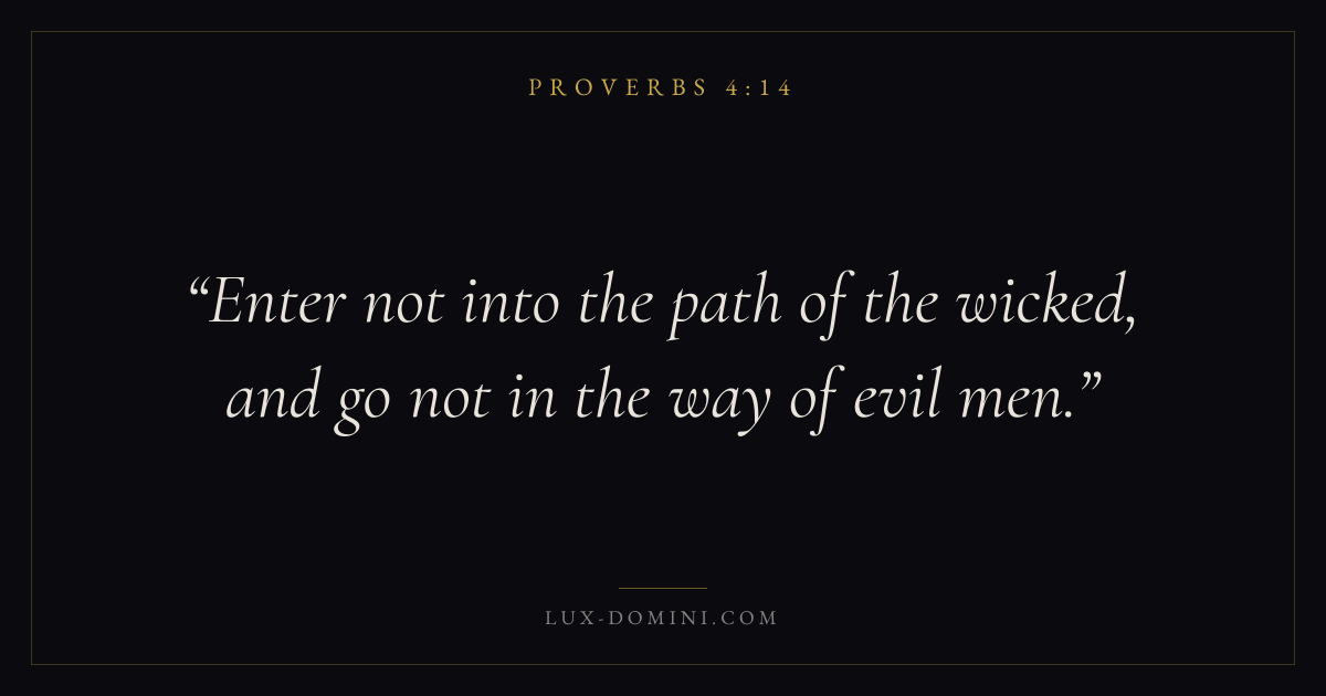 Books / Proverbs / Chapter 4 / Verse 14 ← Proverbs 4:13 Proverbs 4:14 Proverbs 4:15 → Enter not into the path of the wicked, and go not in the way of evil men. Download verse card Share on Twitter Share on Facebook Pin it ✦ Key themes LoveAnxiety and fearWisdomJustice and mercyFear of the Lord Read with Proverbs 4:15Proverbs 4:16John 3:161 Corinthians 13:4 Related topics Bible verses about loveBible verses about anxiety and fearBible verses about wisdomBible verses about justice and mercy ✦ Proverbs Chapter 4 verses V. 1 V. 2 V. 3 V. 4 V. 5 V. 6 V. 7 V. 8 V. 9 V. 10 V. 11 V. 12 V. 13 V. 14 V. 15 V. 16 V. 17 V. 18 V. 19 V. 20 V. 21 V. 22 V. 23 V. 24 V. 25 V. 26 V. 27