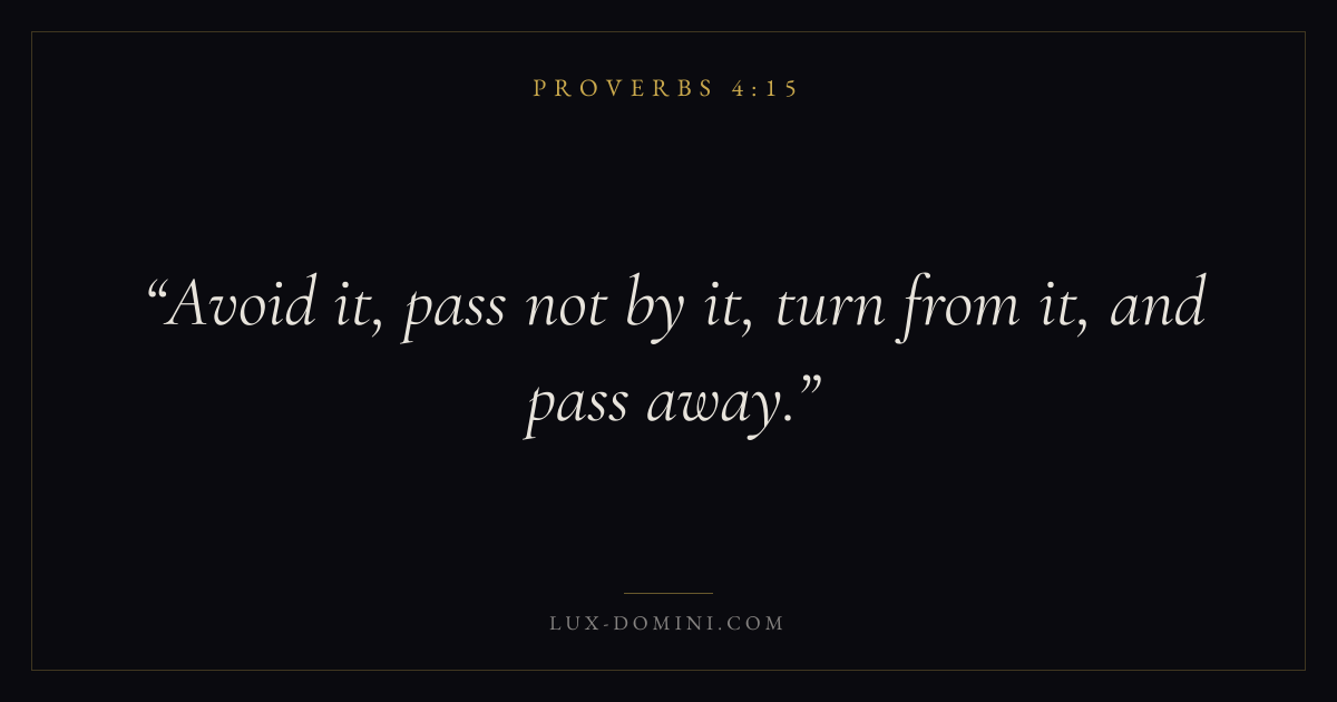 Books / Proverbs / Chapter 4 / Verse 15 ← Proverbs 4:14 Proverbs 4:15 Proverbs 4:16 → Avoid it, pass not by it, turn from it, and pass away. Download verse card Share on Twitter Share on Facebook Pin it ✦ Key themes LoveAnxiety and fearWisdomJustice and mercyFear of the Lord Read with Proverbs 4:14Proverbs 4:16John 3:161 Corinthians 13:4 Related topics Bible verses about loveBible verses about anxiety and fearBible verses about wisdomBible verses about justice and mercy ✦ Proverbs Chapter 4 verses V. 1 V. 2 V. 3 V. 4 V. 5 V. 6 V. 7 V. 8 V. 9 V. 10 V. 11 V. 12 V. 13 V. 14 V. 15 V. 16 V. 17 V. 18 V. 19 V. 20 V. 21 V. 22 V. 23 V. 24 V. 25 V. 26 V. 27