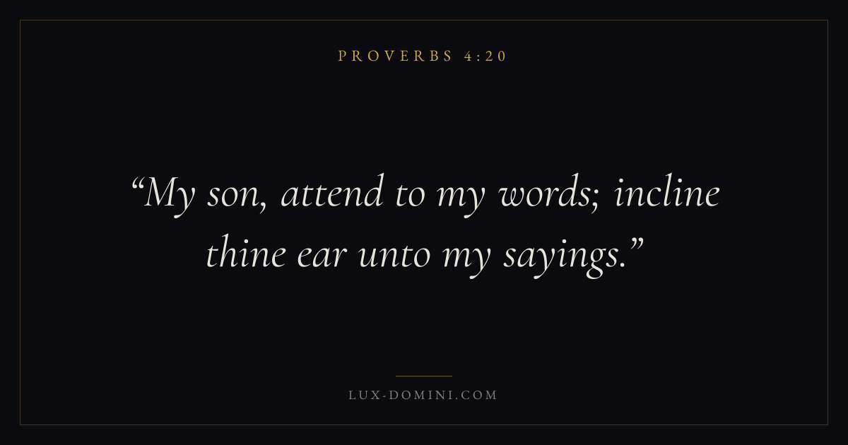 Books / Proverbs / Chapter 4 / Verse 20 ← Proverbs 4:19 Proverbs 4:20 Proverbs 4:21 → My son, attend to my words; incline thine ear unto my sayings. Download verse card Share on Twitter Share on Facebook Pin it ✦ Key themes LoveAnxiety and fearWisdomJustice and mercyFear of the Lord Read with Proverbs 4:21Proverbs 4:22John 3:161 Corinthians 13:4 Related topics Bible verses about loveBible verses about anxiety and fearBible verses about wisdomBible verses about justice and mercy ✦ Proverbs Chapter 4 verses V. 1 V. 2 V. 3 V. 4 V. 5 V. 6 V. 7 V. 8 V. 9 V. 10 V. 11 V. 12 V. 13 V. 14 V. 15 V. 16 V. 17 V. 18 V. 19 V. 20 V. 21 V. 22 V. 23 V. 24 V. 25 V. 26 V. 27