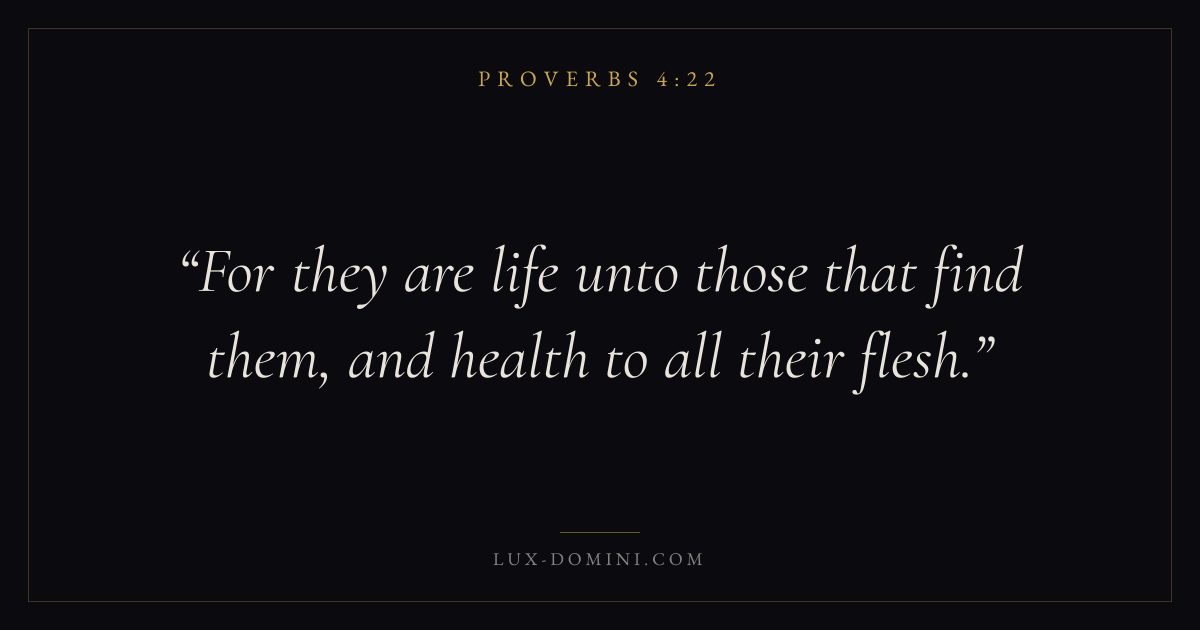 Books / Proverbs / Chapter 4 / Verse 22 ← Proverbs 4:21 Proverbs 4:22 Proverbs 4:23 → For they are life unto those that find them, and health to all their flesh. Download verse card Share on Twitter Share on Facebook Pin it ✦ Key themes LoveAnxiety and fearWisdomJustice and mercyFear of the Lord Read with Proverbs 4:20Proverbs 4:21John 3:161 Corinthians 13:4 Related topics Bible verses about loveBible verses about anxiety and fearBible verses about wisdomBible verses about justice and mercy ✦ Proverbs Chapter 4 verses V. 1 V. 2 V. 3 V. 4 V. 5 V. 6 V. 7 V. 8 V. 9 V. 10 V. 11 V. 12 V. 13 V. 14 V. 15 V. 16 V. 17 V. 18 V. 19 V. 20 V. 21 V. 22 V. 23 V. 24 V. 25 V. 26 V. 27