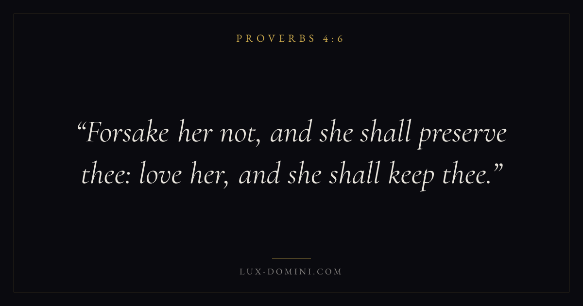 Books / Proverbs / Chapter 4 / Verse 6 ← Proverbs 4:5 Proverbs 4:6 Proverbs 4:7 → Forsake her not, and she shall preserve thee: love her, and she shall keep thee. Download verse card Share on Twitter Share on Facebook Pin it ✦ Key themes LoveAnxiety and fearWisdomJustice and mercyFear of the Lord Read with Proverbs 4:7John 3:161 Corinthians 13:4Philippians 4:6 Related topics Bible verses about loveBible verses about anxiety and fearBible verses about wisdomBible verses about justice and mercy ✦ Proverbs Chapter 4 verses V. 1 V. 2 V. 3 V. 4 V. 5 V. 6 V. 7 V. 8 V. 9 V. 10 V. 11 V. 12 V. 13 V. 14 V. 15 V. 16 V. 17 V. 18 V. 19 V. 20 V. 21 V. 22 V. 23 V. 24 V. 25 V. 26 V. 27