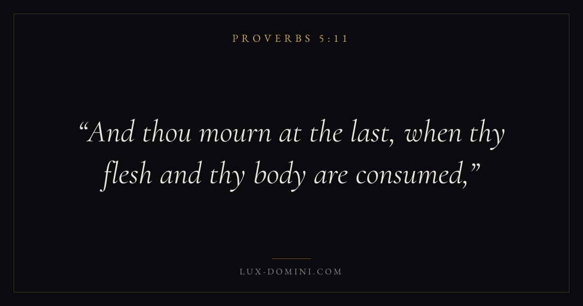 Books / Proverbs / Chapter 5 / Verse 11 ← Proverbs 5:10 Proverbs 5:11 Proverbs 5:12 → And thou mourn at the last, when thy flesh and thy body are consumed, Download verse card Share on Twitter Share on Facebook Pin it ✦ Key themes Anxiety and fearWisdomJustice and mercyFear of the Lord Read with Proverbs 5:8Proverbs 5:9Philippians 4:6Isaiah 41:10 Related topics Bible verses about anxiety and fearBible verses about wisdomBible verses about justice and mercy ✦ Proverbs Chapter 5 verses V. 1 V. 2 V. 3 V. 4 V. 5 V. 6 V. 7 V. 8 V. 9 V. 10 V. 11 V. 12 V. 13 V. 14 V. 15 V. 16 V. 17 V. 18 V. 19 V. 20 V. 21 V. 22 V. 23