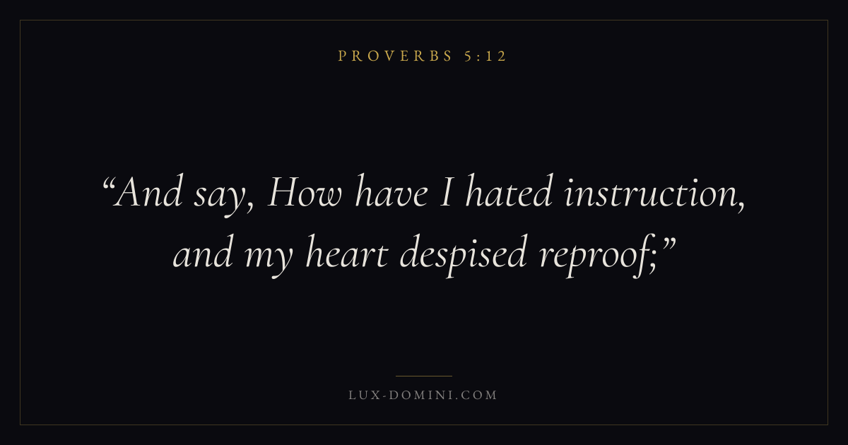 Books / Proverbs / Chapter 5 / Verse 12 ← Proverbs 5:11 Proverbs 5:12 Proverbs 5:13 → And say, How have I hated instruction, and my heart despised reproof; Download verse card Share on Twitter Share on Facebook Pin it ✦ Key themes Anxiety and fearWisdomJustice and mercyFear of the Lord Read with Proverbs 5:8Proverbs 5:9Philippians 4:6Isaiah 41:10 Related topics Bible verses about anxiety and fearBible verses about wisdomBible verses about justice and mercy ✦ Proverbs Chapter 5 verses V. 1 V. 2 V. 3 V. 4 V. 5 V. 6 V. 7 V. 8 V. 9 V. 10 V. 11 V. 12 V. 13 V. 14 V. 15 V. 16 V. 17 V. 18 V. 19 V. 20 V. 21 V. 22 V. 23