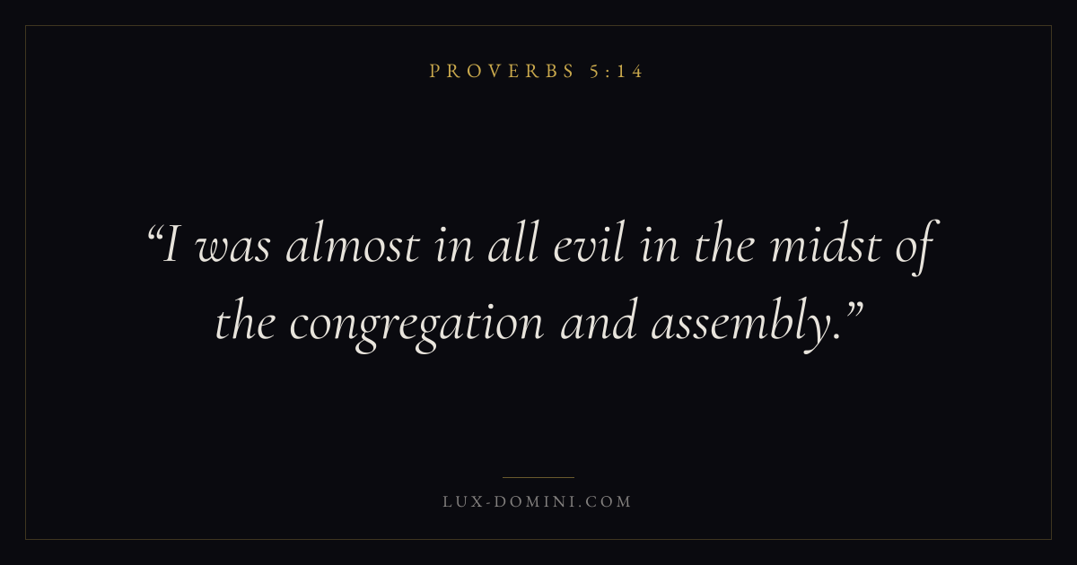 Books / Proverbs / Chapter 5 / Verse 14 ← Proverbs 5:13 Proverbs 5:14 Proverbs 5:15 → I was almost in all evil in the midst of the congregation and assembly. Download verse card Share on Twitter Share on Facebook Pin it ✦ Key themes Anxiety and fearWisdomJustice and mercyFear of the Lord Read with Proverbs 5:13Philippians 4:6Isaiah 41:10Proverbs 1:7 Related topics Bible verses about anxiety and fearBible verses about wisdomBible verses about justice and mercy ✦ Proverbs Chapter 5 verses V. 1 V. 2 V. 3 V. 4 V. 5 V. 6 V. 7 V. 8 V. 9 V. 10 V. 11 V. 12 V. 13 V. 14 V. 15 V. 16 V. 17 V. 18 V. 19 V. 20 V. 21 V. 22 V. 23