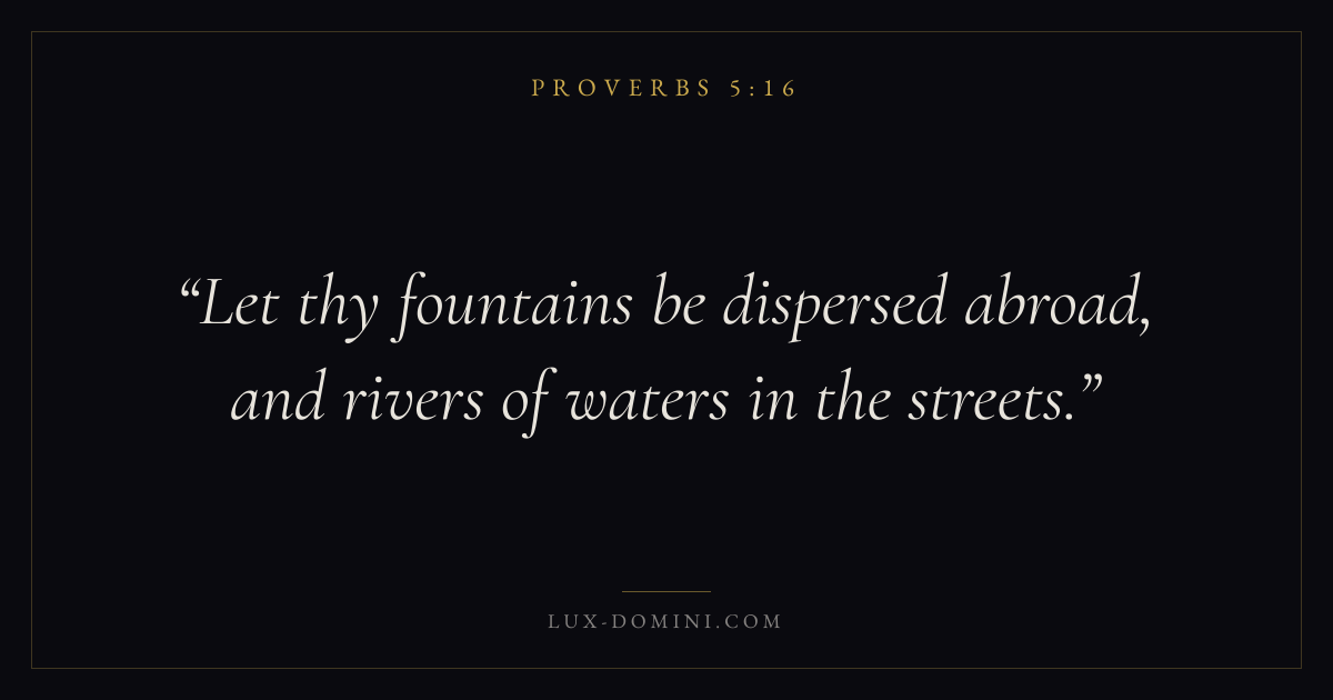 Books / Proverbs / Chapter 5 / Verse 16 ← Proverbs 5:15 Proverbs 5:16 Proverbs 5:17 → Let thy fountains be dispersed abroad, and rivers of waters in the streets. Download verse card Share on Twitter Share on Facebook Pin it ✦ Key themes Anxiety and fearWisdomJustice and mercyTruthFear of the Lord Read with Proverbs 5:15Philippians 4:6Isaiah 41:10Proverbs 1:7 Related topics Bible verses about anxiety and fearBible verses about wisdomBible verses about justice and mercyBible verses about truth ✦ Proverbs Chapter 5 verses V. 1 V. 2 V. 3 V. 4 V. 5 V. 6 V. 7 V. 8 V. 9 V. 10 V. 11 V. 12 V. 13 V. 14 V. 15 V. 16 V. 17 V. 18 V. 19 V. 20 V. 21 V. 22 V. 23