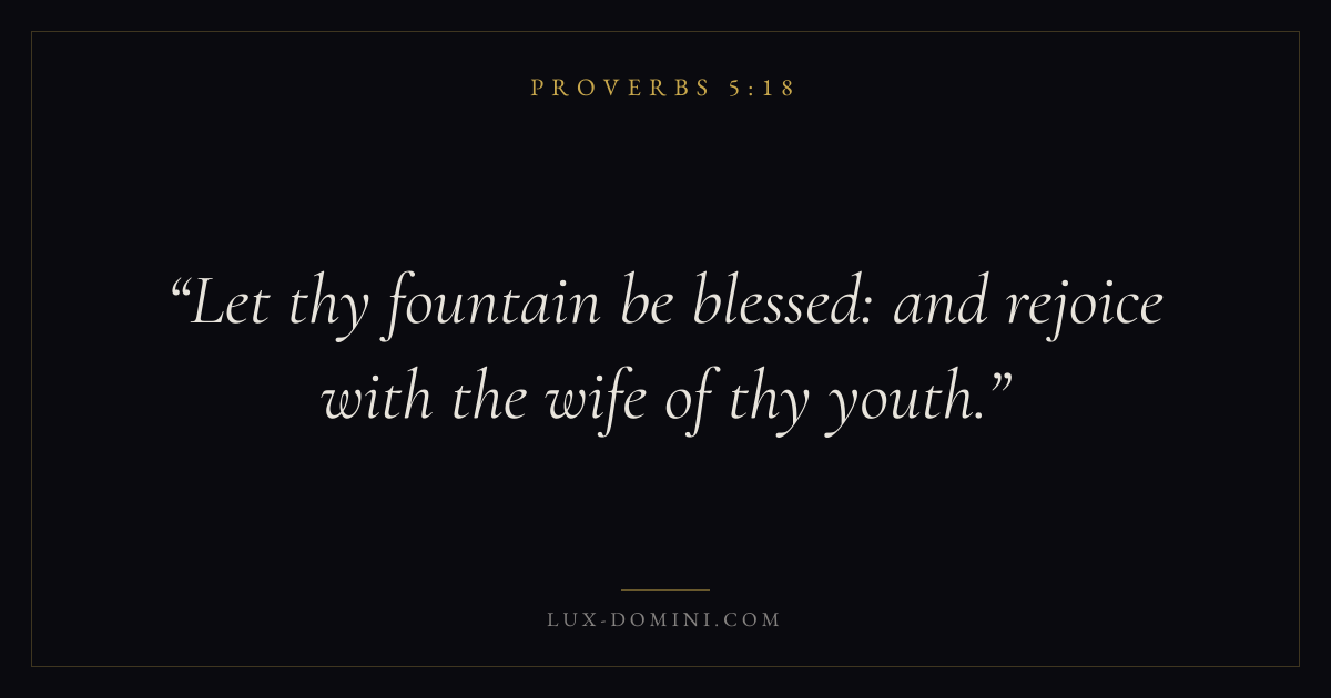 Books / Proverbs / Chapter 5 / Verse 18 ← Proverbs 5:17 Proverbs 5:18 Proverbs 5:19 → Let thy fountain be blessed: and rejoice with the wife of thy youth. Download verse card Share on Twitter Share on Facebook Pin it ✦ Key themes Anxiety and fearWisdomJustice and mercyTruthFear of the Lord Read with Proverbs 5:17Philippians 4:6Isaiah 41:10Proverbs 1:7 Related topics Bible verses about anxiety and fearBible verses about wisdomBible verses about justice and mercyBible verses about truth ✦ Proverbs Chapter 5 verses V. 1 V. 2 V. 3 V. 4 V. 5 V. 6 V. 7 V. 8 V. 9 V. 10 V. 11 V. 12 V. 13 V. 14 V. 15 V. 16 V. 17 V. 18 V. 19 V. 20 V. 21 V. 22 V. 23