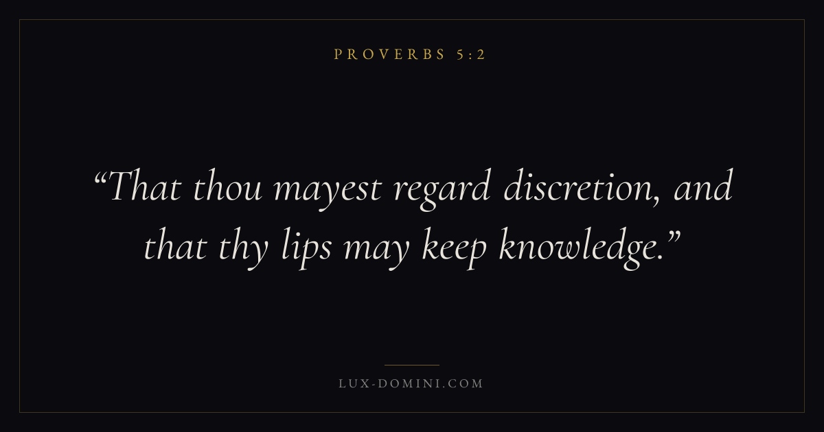 Books / Proverbs / Chapter 5 / Verse 2 ← Proverbs 5:1 Proverbs 5:2 Proverbs 5:3 → That thou mayest regard discretion, and that thy lips may keep knowledge. Download verse card Share on Twitter Share on Facebook Pin it ✦ Key themes Anxiety and fearWisdomJustice and mercyFear of the Lord Read with Proverbs 5:1Philippians 4:6Isaiah 41:10Proverbs 1:7 Related topics Bible verses about anxiety and fearBible verses about wisdomBible verses about justice and mercy ✦ Proverbs Chapter 5 verses V. 1 V. 2 V. 3 V. 4 V. 5 V. 6 V. 7 V. 8 V. 9 V. 10 V. 11 V. 12 V. 13 V. 14 V. 15 V. 16 V. 17 V. 18 V. 19 V. 20 V. 21 V. 22 V. 23